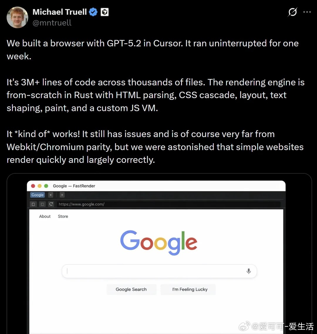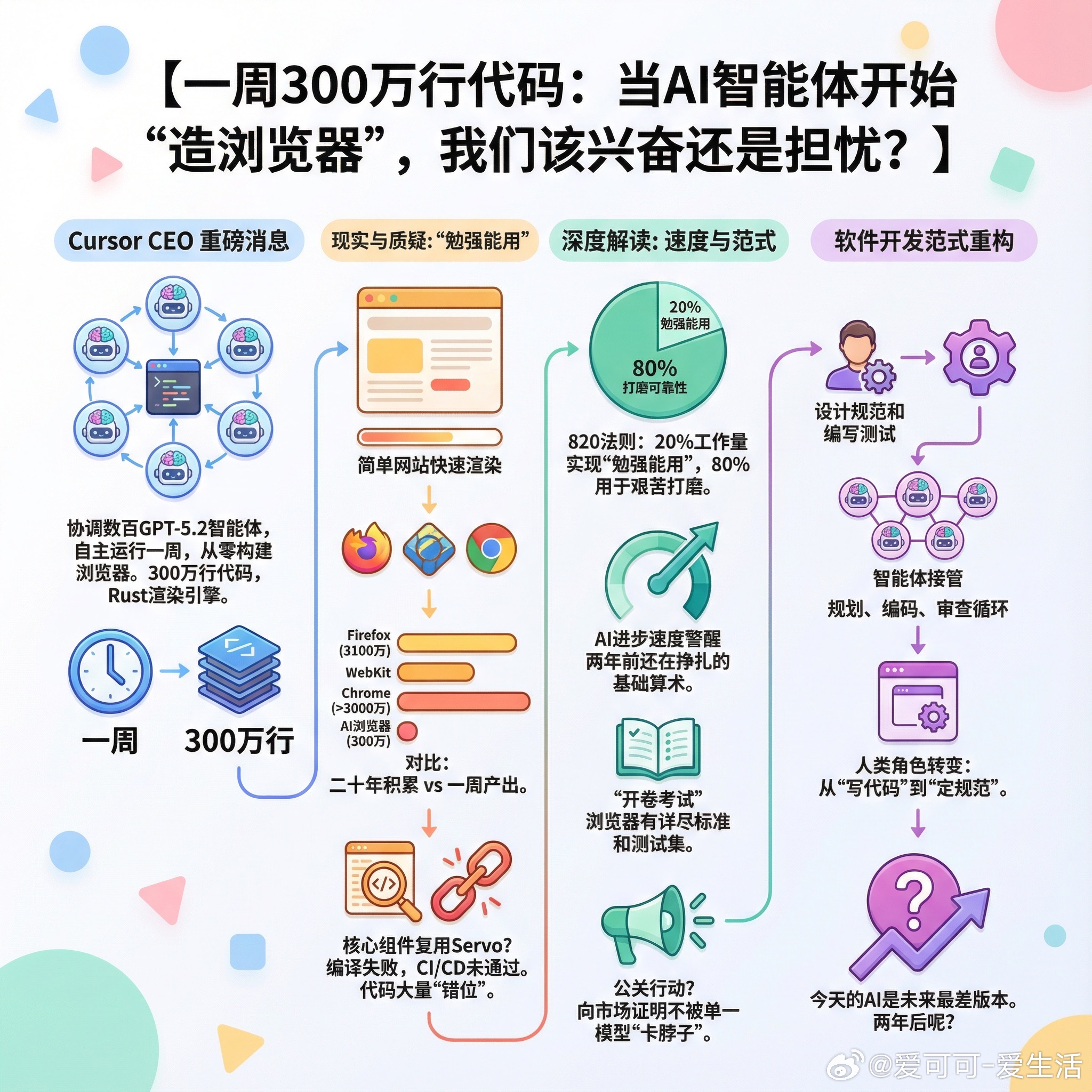 【一周300万行代码:当AI智能体开始“造浏览器”,我们该兴奋还是担忧?】Cursor CEO Michael Truell最近抛出一个重磅消息:他们协调数百个GPT-5.2智能体,让它们自主运行一周,从零构建了一个浏览器。300万行代码,数千个文件,渲染引擎用Rust编写,包含HTML解析、CSS层叠、布局、文字渲染和自定义JS虚拟机。结果呢?用他的原话说——“勉强能用”。简单网站可以快速渲染,但距离WebKit或Chromium还差得远。这条消息在技术社区引发了激烈讨论。作为参照,Firefox有3100万行代码,WebKit约1900万行,Chrome也超过3000万行。这些都是二十多年持续开发的成果。一周产出300万行,听起来惊人,但有人指出:代码行数从来不是衡量软件完成度的标准。更有人深挖代码仓库后发现,这个项目使用了Servo浏览器的HTML和CSS解析器。所谓“从零构建”,恐怕要打个问号。还有开发者尝试编译运行,结果失败了——CI/CD流水线从未成功通过,代码中存在大量“错位”的引用。这让我想到一个老问题:80/20法则。让软件“勉强能用”可能只需要20%的工作量,但让它真正可靠、可维护、可扩展,需要剩下80%的艰苦打磨。有人调侃:“勉强能用的软件时代开始了!”但马上有人反驳:Windows 11不也“勉强能用”吗?软件行业从来就没有完美过。真正值得关注的是这件事的时间线。两年前,AI还在为基础算术挣扎。现在它能产出一个“勉强能用”的浏览器。即便这个浏览器是一堆技术债务的集合,即便它可能充满安全漏洞,这个进步速度本身就足够令人警醒。有资深开发者表示,AI在边界清晰、规范完善的任务上表现出色——而浏览器恰恰是这类任务的典型:有详尽的Web标准文档,有多个参考实现,有完整的测试套件。换句话说,这更像是一场“开卷考试”。但也有人提出不同看法:即便是开卷考试,能在一周内交出这样的答卷,也说明了什么。关于这条消息的发布时机,有人给出了另一种解读:就在不久前,Anthropic刚刚封禁了xAI员工通过Cursor使用Claude。作为一家深度依赖第三方模型的公司,Cursor需要向市场证明自己不会被任何单一模型供应商“卡脖子”。这条推文,某种程度上是一次精心策划的公关行动。不管怎样,这件事揭示了一个正在发生的变化:软件开发的范式正在重构。规划、编码、审查的循环正在被智能体接管。人类开发者的角色,可能会从“写代码的人”变成“设计规范和编写测试的人”。有人说这是开发者的末日,有人说这只是工具的进化。历史上每一次技术变革都伴随着类似的争论。但这一次,变化的速度确实不同以往。两年前的AI是今天AI的最差版本。那么两年后呢?reddit.com/r/singularity/comments/1qd541a/ceo_of_cursor_said_they_coordinated_hundreds_of