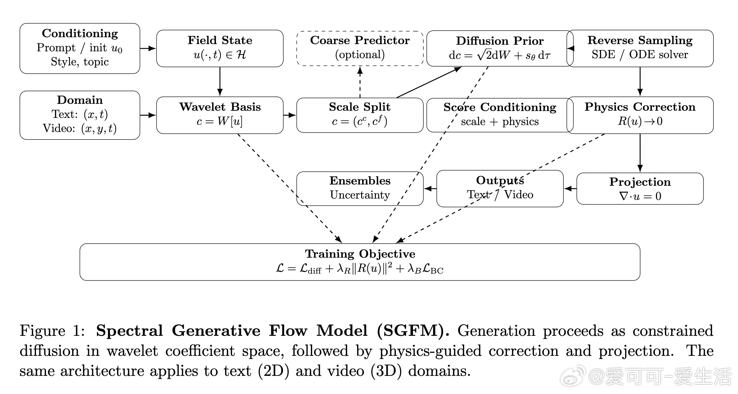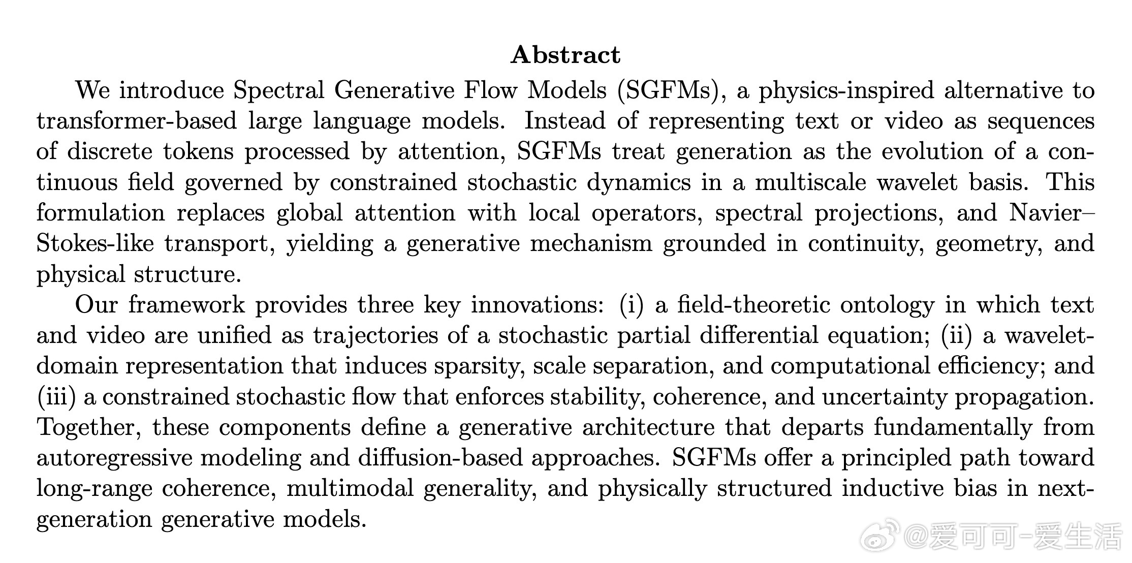 [LG]《Spectral Generative Flow Models: A Physics-Inspired Replacement for Vectorized Large Language Models》A Kiruluta [UC Berkeley] (2026) 生成式AI的范式正在发生根本性的动摇。长期以来,我们习惯了Transformer架构和Token化(Tokenization)的离散思维,本文提出的“谱生成流模型”(Spectral Generative Flow Models, SGFM)宣告:注意力机制可能只是一个过渡,物理启发下的连续场动力学才是未来。以下是关于这一范式转移的深度解析:1. 告别注意力的“二次方枷锁”Transformer架构的成功建立在全局注意力机制上,但其$O(N^2)$的计算复杂度让长文本和高分辨率视频生成面临巨大的成本瓶颈。SGFM提出了一个深刻的洞见:注意力并非智能的基石,而只是对信息传播的一种计算近似。在物理世界中,长程相干性是通过局部动力学随时间的累积而产生的,而非瞬时的全局耦合。SGFM通过局部算子和谱投影,将复杂度降至$O(N \log N)$,彻底绕过了注意力的瓶颈。2. 从离散Token到连续场的本体论跃迁目前的vLLM(向量化大语言模型)将文本视为离散符号的序列,这在本质上破坏了语义的几何结构。SGFM引入了场论视角,将生成视为连续场在函数空间中的演化。文本不再是珠串,而是流动的河水。这种从离散到连续的转变,让模型能够直接利用微分算子、拓扑学和度量结构,使语义的平滑插值和不确定性的动态传播成为可能。3. 纳维-斯托克斯方程:生成的物理模板SGFM最令人惊叹的创新在于借用了流体力学中的纳维-斯托克斯(Navier-Stokes)方程作为生成先验。研究者将文本生成视为二维不可压缩流,视频生成则是三维流。流体动力学中的“不可压缩性”被转化为一种语义约束,防止生成过程中信息的凭空消失或幻觉的无序产生。这种物理启发式的归纳偏置,为模型提供了天然的稳定性与相干性。4. 小波变换:多尺度结构的效率王牌为了实现极高的数据效率,SGFM在小波谱空间(Wavelet Domain)中进行操作。小波变换天然具备空间和频率的局部性:低频系数捕捉全局语义和叙事结构,高频系数刻画局部语法和纹理细节。这模仿了人类的认知过程:先有大纲,再填细节。这种尺度分离不仅减少了样本复杂度,更让模型在处理长程依赖时游刃有余。5. 维度的普适性:统一文本与视频在SGFM框架下,文本(2D)和视频(3D)在数学表达上是完全统一的。不同模态之间不再需要特定的Token化方案或复杂的架构调整,唯一的变量只是定义域的维度。这种“维度普适性”镜像了物理统一场论的理想——同一套方程,既能描述文字的流动,也能刻画光影的变迁。6. 训练目标:统计匹配与物理约束的交响SGFM的训练不再仅仅是简单的似然估计,而是一个复合目标:它结合了扩散模型的得分匹配(Score Matching)来学习分布,以及物理残差损失来强制执行守恒定律。这是一种受约束的随机演化,确保生成的每一个步骤都既符合统计规律,又满足物理逻辑。这种结构化的约束,是解决AI幻觉问题的硬核路径。深度思考:我们正处于从“注意力中心化”向“结构化流动力学”转型的节点。Transformer教会了我们如何利用大规模数据进行统计模拟,而SGFM则试图赋予模型一种“物理直觉”。如果说Transformer是在做符号的排列组合,那么SGFM就是在构建语义的物理规律。生成不再是预测下一个点,而是引导一场流动的演变。arxiv.org/abs/2601.08893