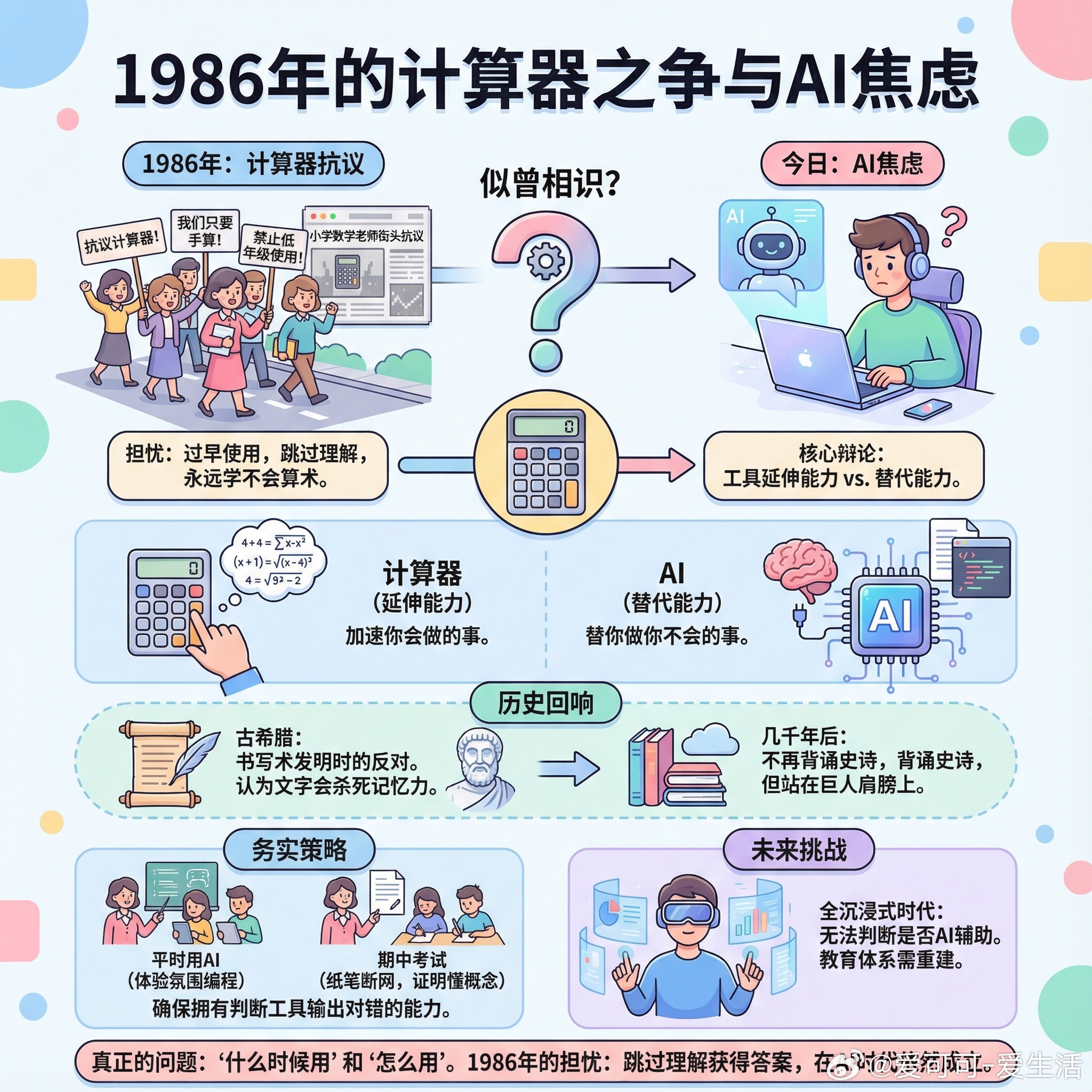 【1986年的计算器之争,照见今天的AI焦虑】一张1986年的老报纸照片在网上引发热议:小学数学老师们举着标语牌走上街头,抗议在低年级过早使用计算器。他们的担忧很朴素——如果孩子们还没学会算术就开始按按钮,他们永远不会真正理解数字。快进近四十年,这场景是不是似曾相识?有意思的是,评论区的讨论远比想象中复杂。一派人认为老师们是对的。事实上,他们确实赢了这场争论——直到今天,学生仍然要先学手算,再用计算器。一位数学专业的网友甚至坦言:我拿了数学学位,但从没背过乘法表,也不会长除法。工具的便利并没有让他失去什么,因为高等数学本就不依赖这些。但另一派指出:计算器和AI根本不是一回事。计算器只是加速你已经会做的事,而AI可以直接替你做你不会的事。这就像是——与其说学生在用计算器,不如说他们在Upwork上雇了个人替自己上数学课,而自己在旁边打游戏。这个类比虽然刻薄,却点出了问题的本质:工具是延伸能力,还是替代能力?有人翻出古希腊的旧账:当年书写术发明时,苏格拉底等哲学家强烈反对,认为文字会杀死记忆力,让人变蠢。几千年过去了,我们确实不再像古人那样背诵史诗,但我们也因此能站在更多巨人的肩膀上。一位大学编程教师分享了他的做法:平时鼓励学生随便用AI,但期中考试必须用纸笔、断网完成。先证明你懂概念,再去体验什么叫“氛围编程”。这或许是当下最务实的态度:不是拒绝工具,而是确保在使用工具之前,你已经拥有判断工具输出对错的能力。最发人深省的一条评论是:等到全沉浸式虚拟现实普及,AR眼镜成为标配,你根本无法判断一个人是否在接受AI辅助。到那时,整个教育体系都必须从根基上重建。每一代人都会面对新技术带来的恐慌。但真正的问题从来不是“要不要用”,而是“什么时候用”和“怎么用”。1986年的老师们担心的不是计算器本身,而是孩子们跳过了理解直接获得答案。这个担忧,放在AI时代,依然成立。reddit.com/r/singularity/comments/1qdu56k/a_headline_from_1986