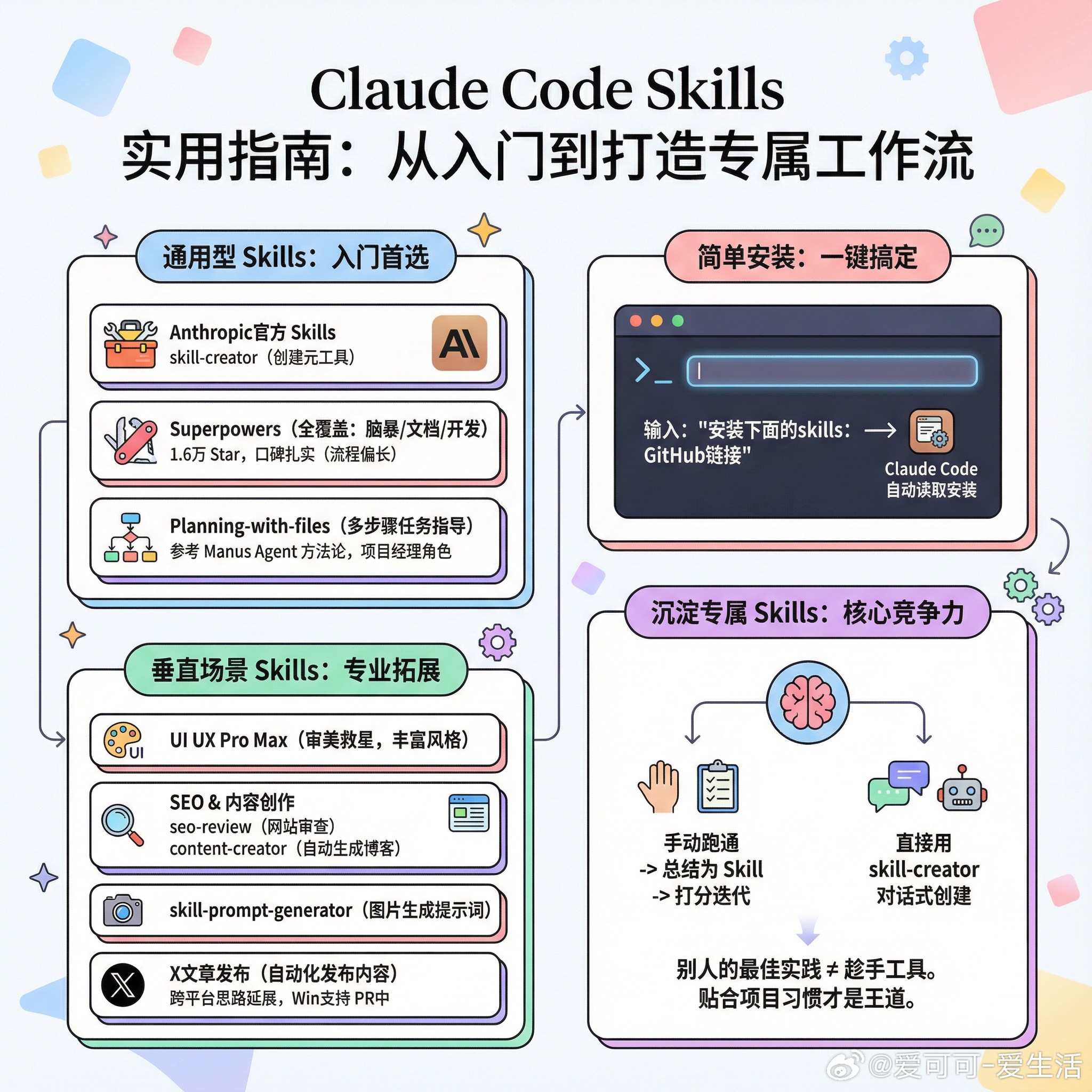 【Claude Code Skills实用指南:从入门到打造专属工作流】最近Claude Code的Skills生态越来越丰富,不少开发者开始分享自己的实战配置。整理了两位博主的推荐清单,顺便聊聊Skills的正确打开方式。先看通用型Skills:Anthropic官方Skills是入门首选,里面的skill-creator尤其值得关注,它本身就是用来创建新Skill的元工具。Superpowers拿下1.6万Star不是没有道理,从脑暴、写需求文档到开发测试全覆盖,口碑相当扎实。不过也有人觉得它流程偏长,如果你习惯快节奏,可以按需取舍。Planning-with-files参考了Manus的Agent方法论,特别适合多步骤复杂任务。一个有意思的用法是:用它来指导其他Skills协同工作,相当于给你的AI助手配了个项目经理。再看垂直场景:做前端的可以试试UI UX Pro Max,对于审美不自信的开发者来说简直是刚需,比官方的frontend-design风格选择更丰富。做内容和SEO的有两个值得关注:seo-review用于网站SEO审查,content-creator能根据关键词自动生成博客文章。需要注意的是,这类Skills往往是作者针对自己项目写的,拿来用之前最好让AI帮你调整适配。skill-prompt-generator是个硬核工具,主要搭配图片生成使用,提示词质量直接决定出图效果。还有个X文章发布Skill,实现了从Claude到X平台的内容发布自动化,思路可以延展到其他平台。已经有人提交了Windows平台支持的PR。安装其实很简单:直接在Claude Code里输入“安装下面的skills:GitHub链接”,它会自动读取并完成安装。但比起囤积别人的Skills,更重要的是沉淀自己的。一个实用的方法:先用Claude Code手动跑通某个工作流,完成后让它总结成Skill,再基于第一性原理打分迭代。如果觉得麻烦,直接用skill-creator对话式创建也行。别人的Skills是别人的最佳实践,只有贴合自己项目和习惯的,才是真正趁手的工具。x.com/yanhua1010/status/2010690881397940340x.com/bozhou_ai/status/2011309102279114802