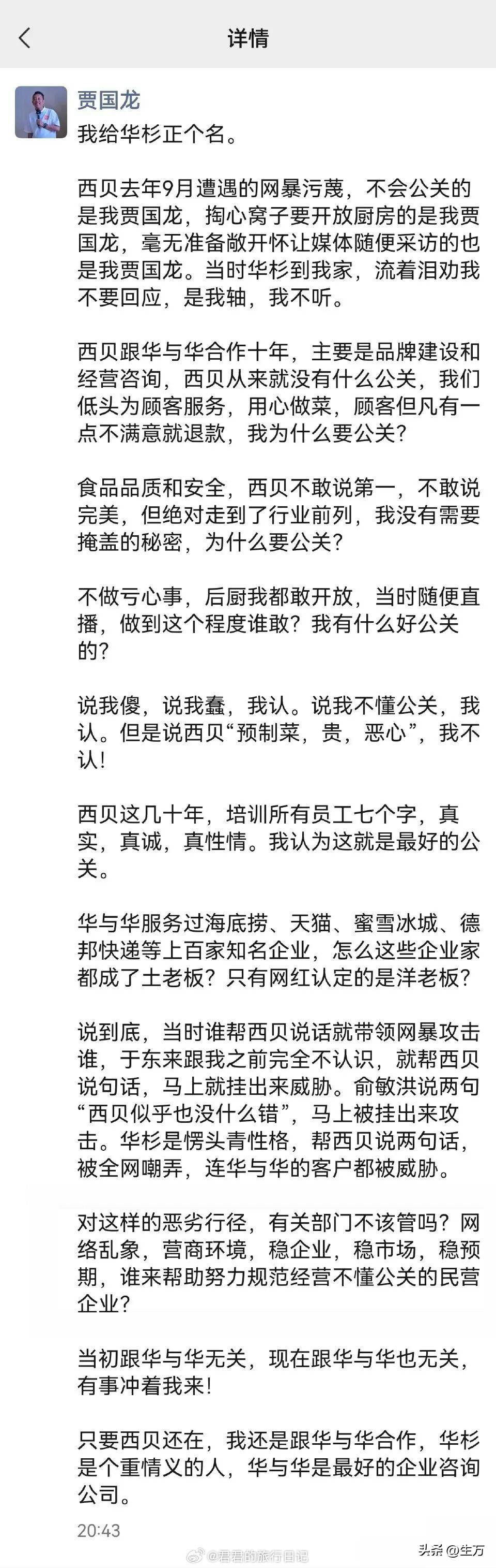 贾国龙:我给华与华正个名! 昨天晚上,贾国龙又一次发了一个比较长的朋友圈,专门解释他的老朋友,也算得上是老的合作伙伴华与华。 在他看来,华与华的做事风格与他不一样,在处理与罗永浩之间的关系的时候,他们使用的方法也不一样,但是因为这样,他自己觉得有必要发这个朋友圈。 他表示当初出那个事情的时候,他多年的好兄弟,华与华公司的老总华杉,专门来到他家里,情绪比较激动的,哭着劝他,不要回应罗永浩[看] 但他的个性偏偏听不下去,所以他依然呼吁有关部门要这种情况进行管理,就算得上是帮助民营企业了[捂脸] 他把这条朋友圈发了之后,很多人看了觉得他的这个操作又完全是反向的,这个事情已经过去这么几个月了,现在他有些门店都已经开始关了,那就说明在一定程度上这个事情影响到他的生意了,但是他依然来了一个反向操作。 所以很多人对他发的这个朋友圈表示不理解,有真正关心他的朋友表示,真的可以不用说了,因为每次他说这些话 ,好像不但没有效果,而且起到了反作用,但是他偏偏不这样认为,这就是矛盾的地方[捂脸] 不知道接下来他还会不会把这个事情继续梳理下去,也不知道这个事要怎么收场,更不知道他接下来还会不会继续华与化合作,拭目以待吧。
