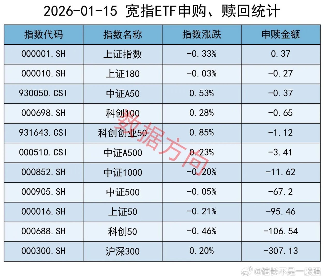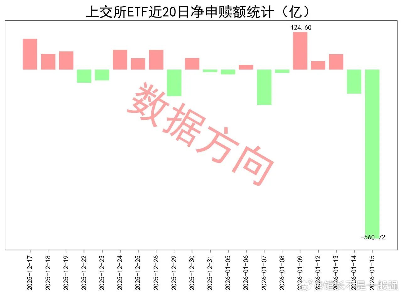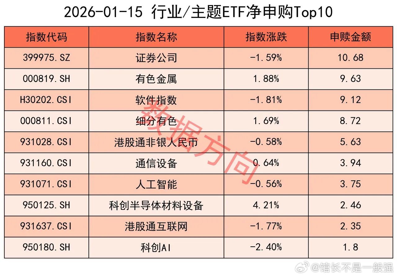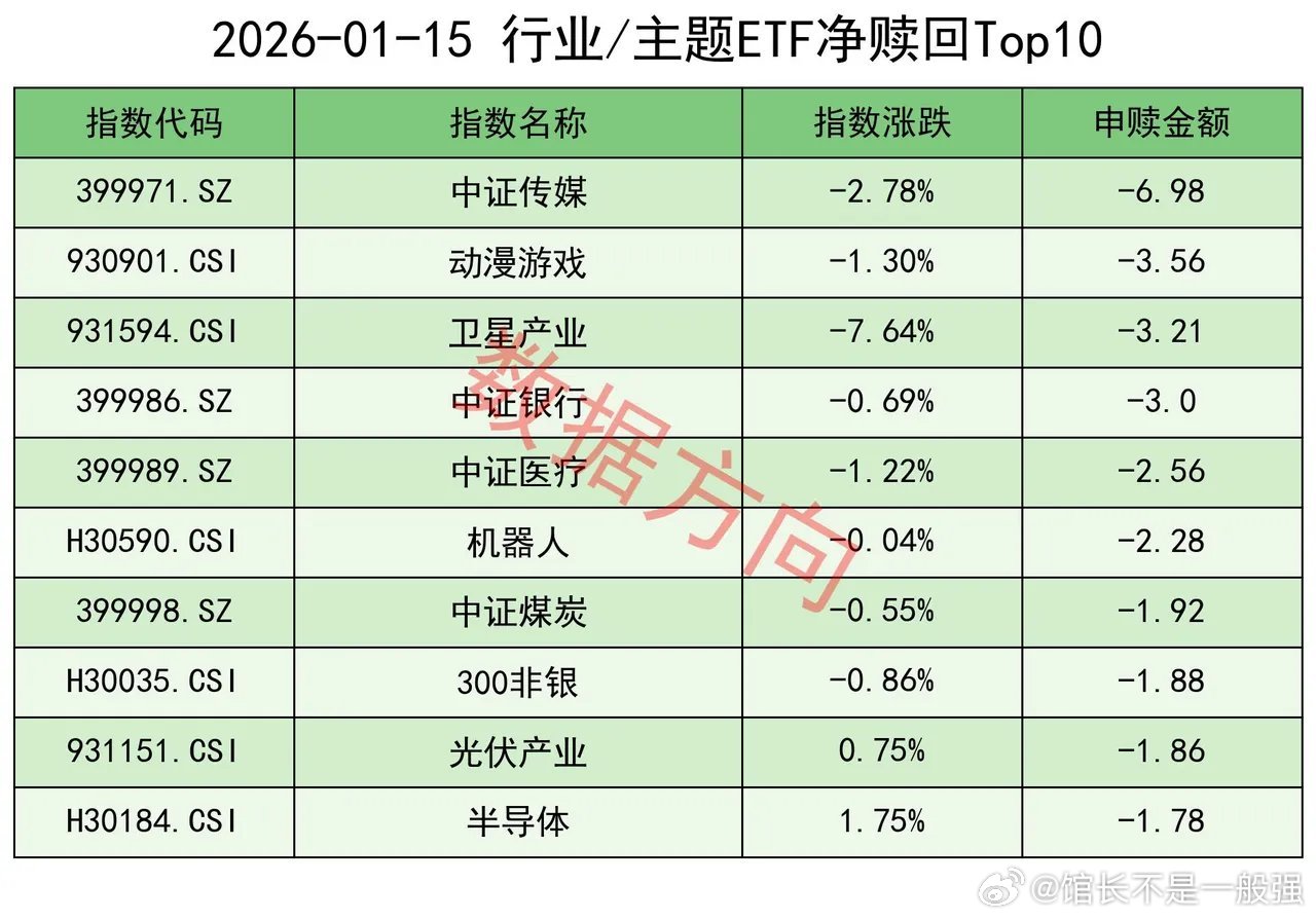 一个不好的信号1月15日星期四,大盘缩量整理,有色金属、基础化工、半导体表现活跃,前期强势品种商业航天、AI应用跌幅居前。上证指数跌幅0.33%,看起来还好。需要注意,上交所ETF合计净赎回560.72亿元,此值创下有史以来单日净赎回的最高纪录,之前的纪录只有202亿。结合到调降融资比例、以及14.5万手净空单压着,一套组合拳下来,1层的意图再明显不过。应该考虑仓控,留得青山在,不怕没柴烧。宽指沪深300指数(-307.13亿),净赎回超过300亿。大家都知道,谁手上持的沪深300最多。除此之外,科创50指数(-106.54亿)、上证50指数(-95.46亿)、中证500指数(-67.2亿),也一起被大幅净赎回中证1000指数(-11.62亿),净赎回超10亿。中证A500指数(-3.41亿)、科创创业50指数(-1.12亿)、科创100指数(-0.65亿)、中证A50指数(-0.37亿)、上证180指数(-0.27亿),分别被小幅净赎回。仅有上证指数(0.37亿)获小幅净申购,几乎可以忽略。行业和主题 证券公司指数(10.68亿)、港股通非银人民币指数(5.63亿),一起进入申购榜。300非银指数(-1.88亿)进入赎回榜。有色金属指数(9.63亿)、细分有色指数(8.72亿),一起进入申购榜。软件指数(9.12亿)、人工智能指数(3.75亿)、科创AI指数(1.8亿),一起进入申购榜。其他进入申购榜的还有:通信设备指数(3.94亿)、科创半导体材料设备指数(2.46亿)、港股通互联网指数(2.35亿)。赎回榜比较乱。中证传媒指数(-6.98亿)、动漫游戏指数(-3.56亿)、其他进入赎回榜的还有:卫星产业指数(-3.21亿)、中证银行指数(-3.0亿)、中证医疗指数(-2.56亿)、机器人指数(-2.28亿)、中证煤炭指数(-1.92亿)、光伏产业指数(-1.86亿)、半导体指数(-1.78亿)。