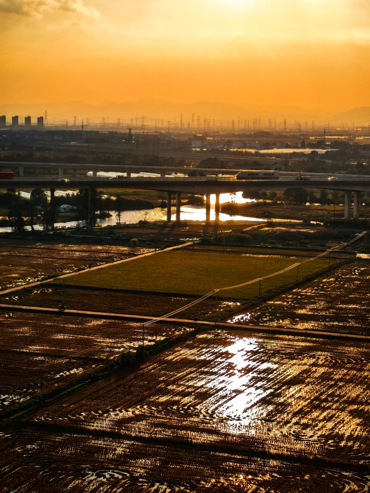 千问配文:夕阳西下,金色的余晖洒满大地,田野与河流在光影中交织出宁静而壮美的画卷。远处的城市轮廓与近处的农田形成鲜明对比,桥梁横跨水面,车流穿梭其间,现代与自然在此刻和谐共存。这是一幅充满诗意的乡村黄昏图景,让人感受到时光的静谧与生活的美好。