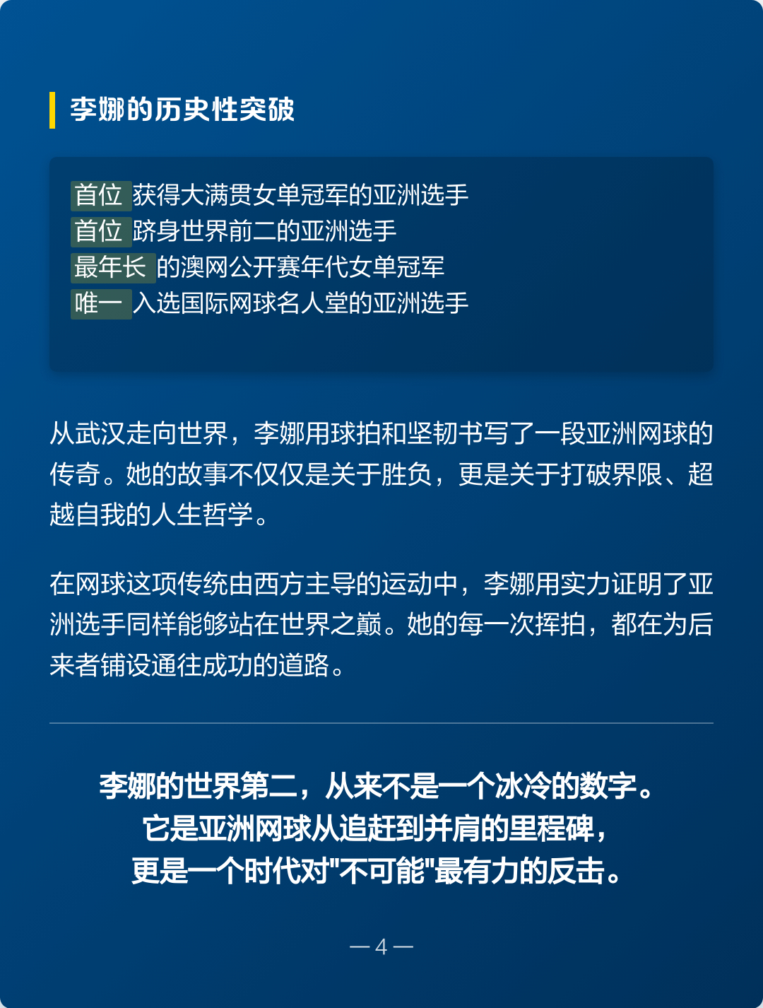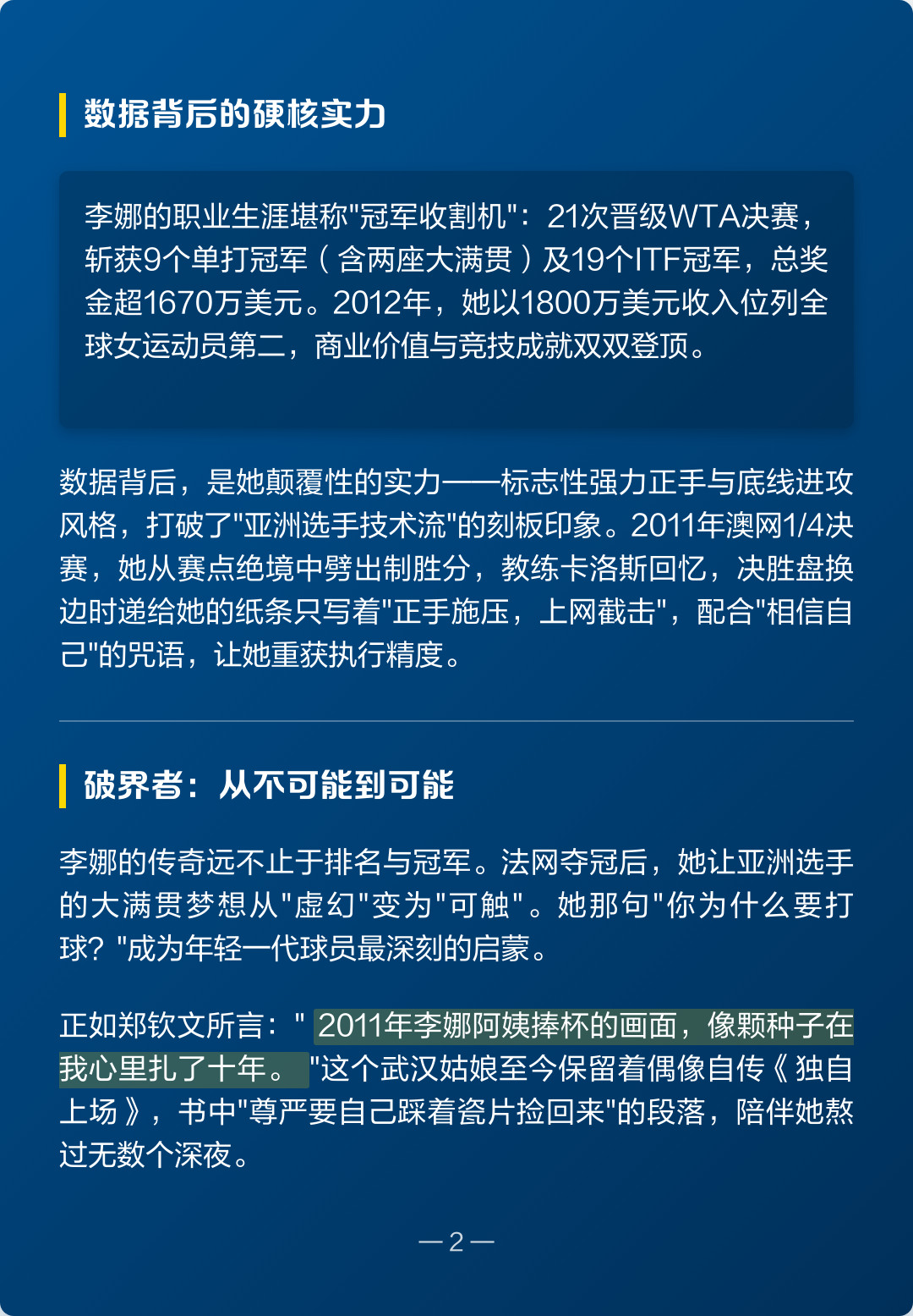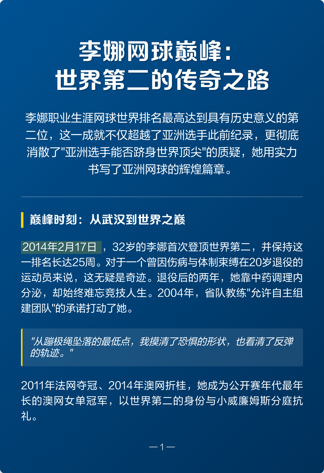李娜43岁状态 李娜以世界第二的职业生涯最高排名创造亚洲网球历史,彻底打破“亚洲选手无缘顶尖”的质疑,为亚洲网球树立全新标杆。李娜说冠军不是衡量运动员的唯一标准
