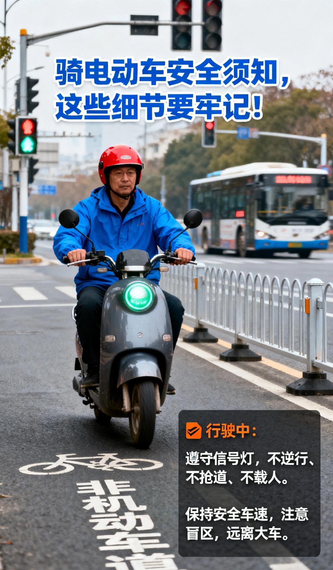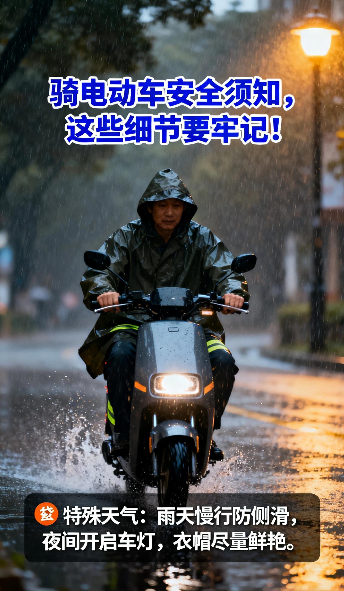 骑电动车时需要注意哪些安全事项? 【骑电动车安全须知,这些细节要牢记!】 骑行千万条,安全第一条! 🔸 出发前:检查刹车、胎压、电量,佩戴合格头盔,系牢卡扣。 🔸 行驶中:遵守信号灯,不逆行、不抢道、不载人。保持安全车速,注意盲区,远离大车。 🔸 特殊天气:雨天慢行防侧滑,夜间开启车灯,衣帽尽量鲜艳。 🔸 停车后:选择非机动车区域,勿占消防通道,及时充电但勿过充。 道路千万条,谨慎每一条。多一分留心,多十分平安! 电动车安全 出行提醒