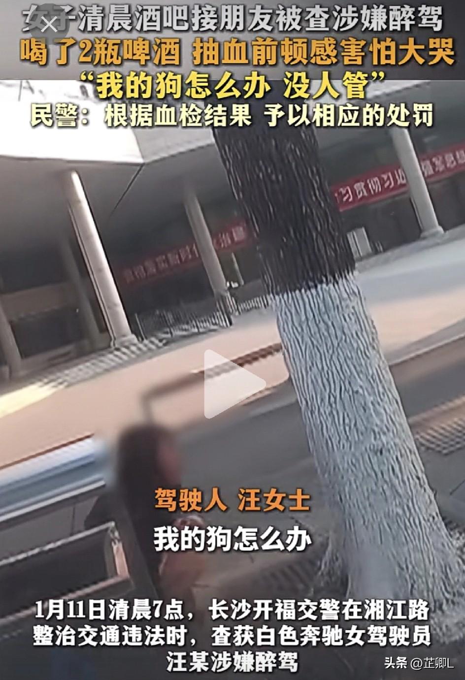 奔驰小姐姐酒驾被抓,蹲地大哭:我家狗狗没人照顾怎么办?网友满头黑线:狗比人还重要吗? 1月11日凌晨7点的长沙街头,交警查酒驾。白色奔驰车窗摇下,吹一口气——好家伙,157mg/100ml!直接飙上醉驾标准线。 开车的汪小姐“哇”一声就蹲马路牙子上了,眼泪比长沙冬天的雨还急,哭的那叫一个“听者伤心、闻者落泪”:“我才这么年轻!我家狗狗怎么办啊?!” What? 交警举着测试仪都愣了两秒。 原来,这位哭成泪人的汪小姐,凌晨时喝了两瓶啤酒,睡没睡醒不知道,大清早就开车去酒吧,接外地来长沙的朋友。 返程途中,遇到了交警整治交通违法,被测出了酒驾。 但有意思的是——从被查到去医院抽血,这姑娘翻来覆去就念叨一件事: “我要是……,我家狗狗怎么办?” “我家狗狗又没人管,怎么办?” 这翻来覆去、心心念念的只有她家的狗!满脑子只有她视如珍宝、真爱如命的毛孩子。 无语到极点的交警表示,要根据她的血检结果,对汪某做出相应的处理。 视频虽然没有说最后的处理结果,单单看汪某的吹气结果,几乎可以肯定的是,拘役+罚款+吊销驾照的豪华套餐是跑不了了。 只是这画面,让人怎么看怎么不舒服。以前的人出了事求情的时候会说,“上有老下有小”,请求可以从轻发落。 这位汪小姐可倒好,反复担心和放不下的只有她家的狗,父母会如何不考虑,工作前途会怎样一概不管,唯一心心念念的只有她家的狗。 网友锐评: “现在有些年轻人,狗比命大。” “狗:这届主人真难带。” “她哭的不是青春,是狗粮没人加。” “建议以后查酒驾加问一句:进去了狗归谁?说不定能吓醒一半人。” 说真的,狗重要吗?重要,但它真的如此重要吗? 在它面前,你的父母亲人、你的未来前途、你此次污点对亲生孩子的影响、“喝酒不开车”的基本规则,通通可以视而不见? 这一幕,荒诞到让人咋舌! 狗,或许是她世界的重要一部分;但她的世界,绝不应该只剩下一只狗。 一个人成熟的标志,不是懂得了如何去爱,而是懂得了爱的次序与分量。 对宠物的爱值得尊重,但对法律、对他人生命、对家人、对自己未来的敬畏与担当,才是立身为人的基石。 因为,你,生而为人,要遵守的是人类社会的规则与秩序。 毕竟,一只被妥善托付的狗,终会等到主人归来;但一些被轻率践踏的东西,比如安全、比如前途、比如亲情,一旦失去,可能就再也追不回来了。 方向盘前,人命关天;人生路上,轻重须辨。 素材来源:风芒新闻,侵联删!