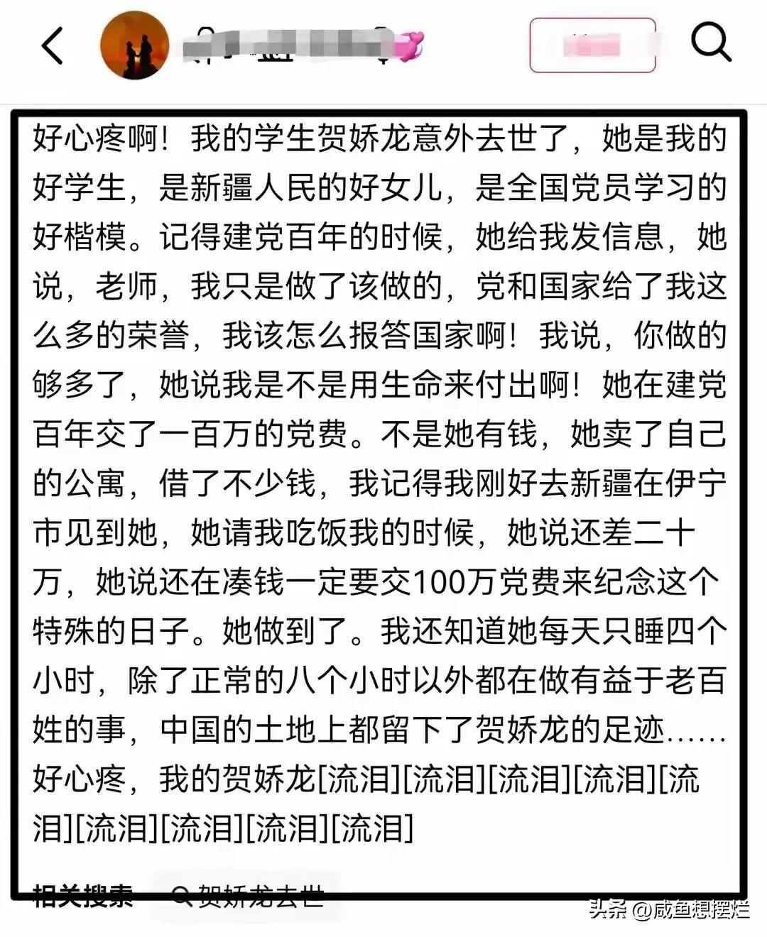贺娇龙去世后,很多人都在关心她的孩子情况,如今在好友这里,我们得到了一个既意外又动人的答案。 原来,贺娇龙并没有自己亲生的孩子,她收养了一个聋哑女孩,视如己出,给了她一个完整的家和全部的爱。 在很多人看来,抚养一个聋哑孩子需要付出常人难以想象的艰辛,但贺娇龙却把这看作是她生命里最柔软的牵绊。 这个细节被曝光后,让无数人对这位已经离世的女干部,又添了万分敬佩。 另外好友还透露,贺娇龙和丈夫的感情非常好,她的离开给家人带来了沉重的打击,但是他的丈夫很坚强,不管大事还是小事都在亲力亲为的安排,只为了让妻子走得安心。 贺娇龙的离世,引发全网悼念,大家都感到惋惜和难过,群众的眼睛是雪亮的,大家对她的爱足以证明了她生前无私奉献的精神,甚至用生命重新定义了网红干部。 如今,斯人已逝,那个如同女侠般策马的红衣身影,永远定格在了天山的雪原与草原之间。 她收养的那个聋哑女孩,失去了这位不是亲生却胜似亲生的母亲,但贺娇龙留下的,远不止这些。