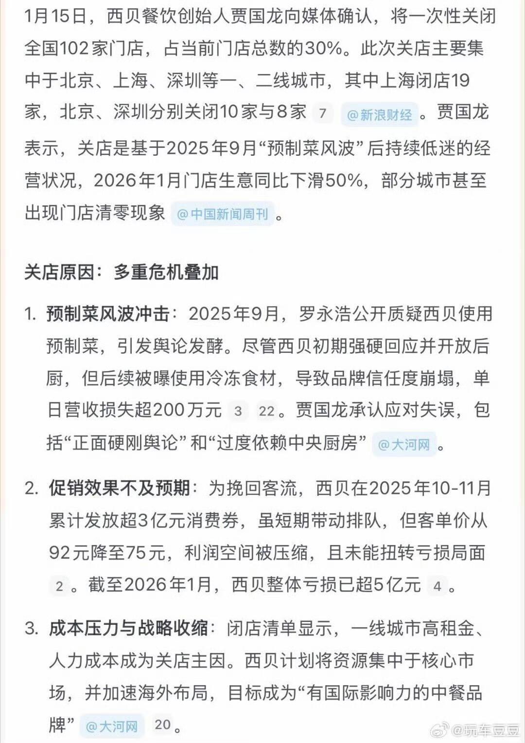 餐饮圈这回动静大了,西贝要一口气关掉全国102家店,差不多三分之一都没了,波及30多个城市,连带着四千来号员工的工作也悬了。 要知道西贝以前多牛啊,春节生意能抵半年收入。现在直接“断臂”,125天就亏了5亿以上。这到底是行业不行了,还是西贝自己走错了路? 看看这次关店,一二线城市是重灾区。上海19家、北京10家、深圳8家、广州5家……这些店以前可都是开在热门商圈的好位置,是流量保证,现在全成了包袱。有内部消息说,关店名单上直接写“谈降租,降不下来就关”。看得出,西贝是真没钱了,压力大到顶不住了。 但说实话,西贝的问题早就埋下了。去年预制菜那事儿就是个爆点。罗永浩公开怼他们“用现做的价格卖预制菜”,一下子就把信任搞崩了。西贝开始还嘴硬,后来才急着开放厨房、改回现做,又是发券又是降价,折腾半天。可消费者不傻,你要么就老实说清楚,像老乡鸡那样明明白白标出来,让人自己选。西贝一边吹“手工现做”,一边偷偷用预制货,这不忽悠人吗?招牌就是这么砸的。 更要命的是,西贝把自己卡在“高成本、低收入”的坑里了。做中高端正餐,租金人工本来就贵,尤其是那些黄金地段的店。去年11月营收才2.65亿,不到往年同期一半,但光工资就发出去1.35亿。现在大家花钱都紧了,整个餐饮业客单价都在跌,可西贝的价格还是下不来,性价比越来越不行,老顾客也留不住。 之前还非要把自己从“西北菜”折腾成“家庭欢乐餐厅”,想拉拢家庭顾客。可信任没了、成本又压不下来,这种表面转型有啥用?都是白费劲。 说到底,西贝今天这个局面,行业环境不好是一方面,但自己步子迈太大、对顾客又不够诚实,才是关键。光靠关店解决不了根本问题,得想想怎么重新获得信任,把成本和价格弄到合理的平衡点。不然,关掉的店可能只是开始。
