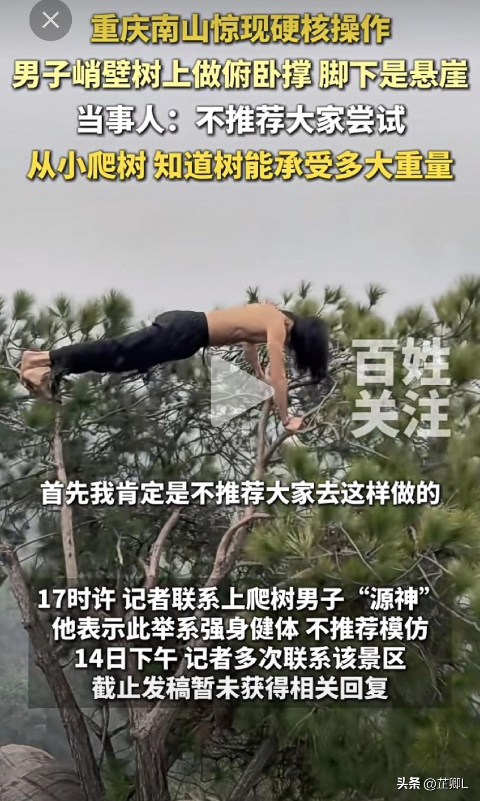 重庆一猛男悬崖树上“花式健身”,百米高空赤膊做俯卧撑,街道办急了:快下来!太危险! 最近重庆南山虚灵峰火了,但不是因为风景,而是因为一个人。 一位大哥在百米悬崖边,赤着膀子,单手……啊不,全身撑在一棵树的树枝上,淡定做起了俯卧撑! 旁边就是深不见底的悬崖,脚下空空荡荡,他倒好,一起一伏,稳如…… 同行队友说:“这是我们登山群群主,平时就狠人!”但也赶紧补一句:“危险动作,不建议学!” 属地街道办工作人员火速赶到,仰着脖子劝:“师傅,下来嘛,这样要不得!”大哥倒也配合,哧溜下来了,还说:“我就摆个造型拍照嘛。” 事后一问,这大哥果然不是一般人:自称每天100个引体向上、500个俯卧撑,还坚持冬泳。 说起悬崖健身,他一脸“我心里有数”:“在我可控范围内,但你们别学啊——摔下去可就真成‘自由落体运动’了!” 网友都看乐了: “这是现实版‘山顶猿人’?” “下次是不是该挑战珠峰顶上倒立了?” “懂了,重庆的山不是用来爬的,是用来‘挂’的。” “这是可把控的问题吗?树上不是做俯卧撑的地方!” “看起来很危险,实际上一点也不安全!” “人不能吃的太饱!” 风景虽好,生命更贵!户外运动千万条,安全第一条,盲目模仿……那后果自己用脚趾头想想,也能猜的出来。 再说了,个人就是喜欢冒险,非冒险不可,可以!但请不要拍照拍视频发社交网络平台,不要带歪了不懂轻重缓急的小孩子!个人独自享受就好! 在此郑重提醒大家伙: 此行为纯属个人“硬核操作”,请各位观众朋友务必保持冷静,该怂就怂,平地上练练也挺好——毕竟,你的命可能没有他的臂力那么稳。 素材来源:百姓关注,侵联删!