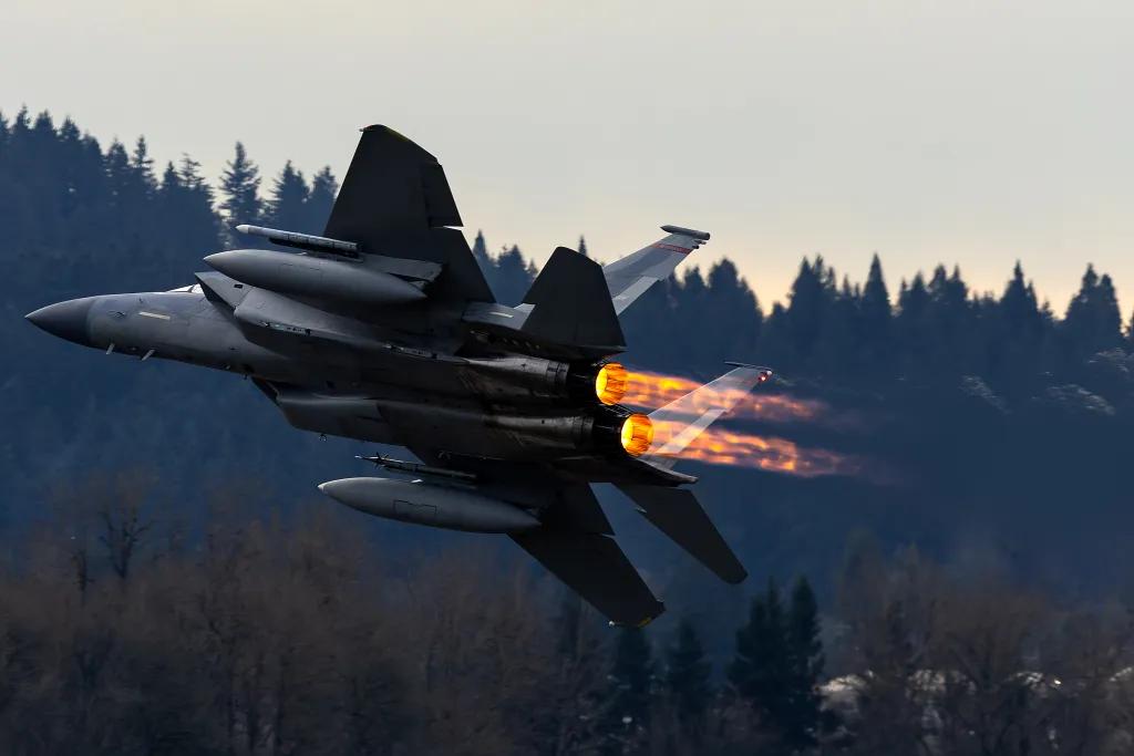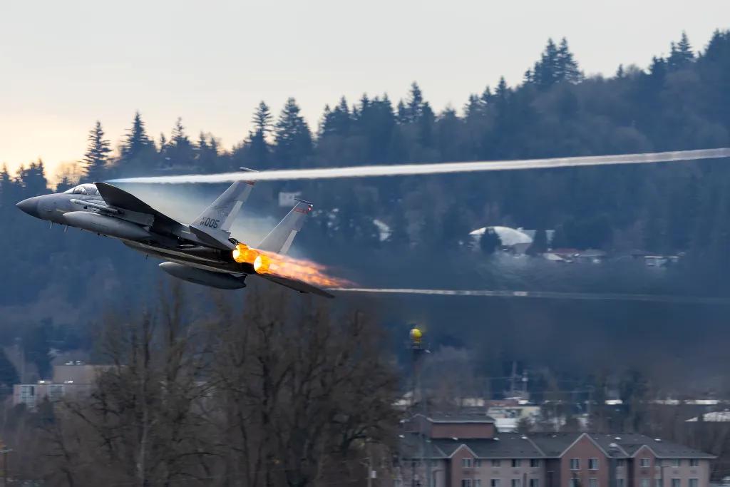 【工业美学——美军最新F-15EX战机爬升的瞬间】 美国波特兰国际机场(该机场同时设有波特兰空军国民警卫队基地,其主要驻地是第142战斗联队/第123战斗机中队,更广为人知的名字是红鹰。),一架美国空军最新F-15EX“鹰式II”在10R跑道末端以全加力状态从机场起飞,快速爬升。
