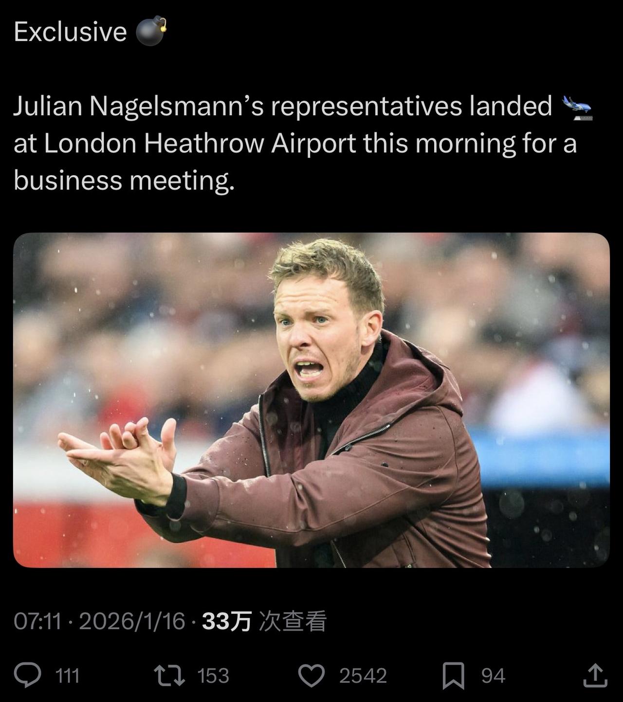 纳格尔斯曼已经飞伦敦了,媒体都在关注他会接触哪家英国俱乐部。