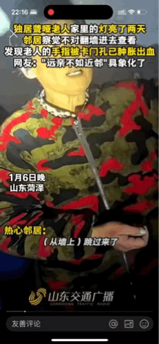 独居聋哑老人,两天都没有出门,家里的灯一直亮着。邻居感觉奇怪,就翻墙到老人家里,看到老人站在门口,一只手指被卡进卡进门锁里,已经肿胀起来了。邻居看到这情况自己也无法解决,便打电话给消防并联系他的家属。老人被解救后家人已经将他送进医院治疗。网友:古人诚不欺我,远亲不如近邻啊! 现在的农村,年轻人都很少见了,村里剩下的都是七十多岁以上的老人,有时生个病,发生了危险都没有人发现,邻里的互相照应就显得难能可贵了。 据媒体报道,近日,山东菏泽的大妈这两天都没有看见隔壁的大爷了,感觉很奇怪。大爷是位聋哑的独居老人,他每天上午和下午都会出门到家门口的小广场遛弯、晒太阳。 大妈心想大爷是去哪了,莫不是被家里的孩子们接走了?还是出了什么事情? 放心不下的大妈就特意去到大爷家门口,看到大爷家的灯还是亮着的,心里便不安起来,可是呼喊敲门都没用,大爷听不见。 于是大妈回家搬了个凳子,踩着凳子翻墙爬进了老人家里,眼前的情景真的把大妈吓了一跳。大爷就在门口,身体靠在墙上,一只手指卡进了门锁里,已经快站不起来了。 原来大爷准备出门的时候开门时不小心把手指卡进了门锁,他已经在门边上靠了两天,没吃没喝没动。 大妈马上给消防队打了电话并联系大爷的孩子,经过半小时的救援后,大爷被送到医院检查并治疗。 网友说,家里也有独居的老人,所以给家里装了监控,每天晚上都会检查一下,而且还和老人约定了,让他每天早晚都在监控前打个招呼。 还有的网友说,真想把独居的老人接到身边,但他们住不惯。 取材网络,侵删