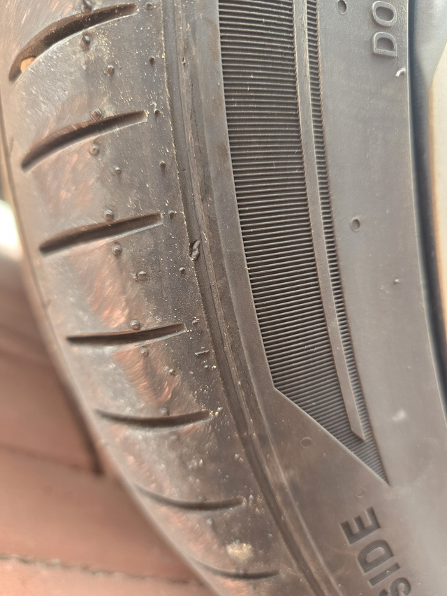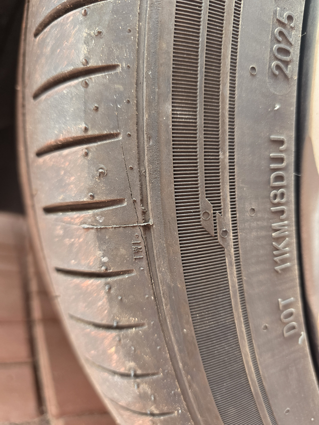 才换两个月的胎裂开了 有点绷不住了,两个月前换了4条雷神静悦pro,今天检查胎压的时候发现左前胎居然有两条裂纹,我裂开了,已经申请售后了,看后边怎么处理吧