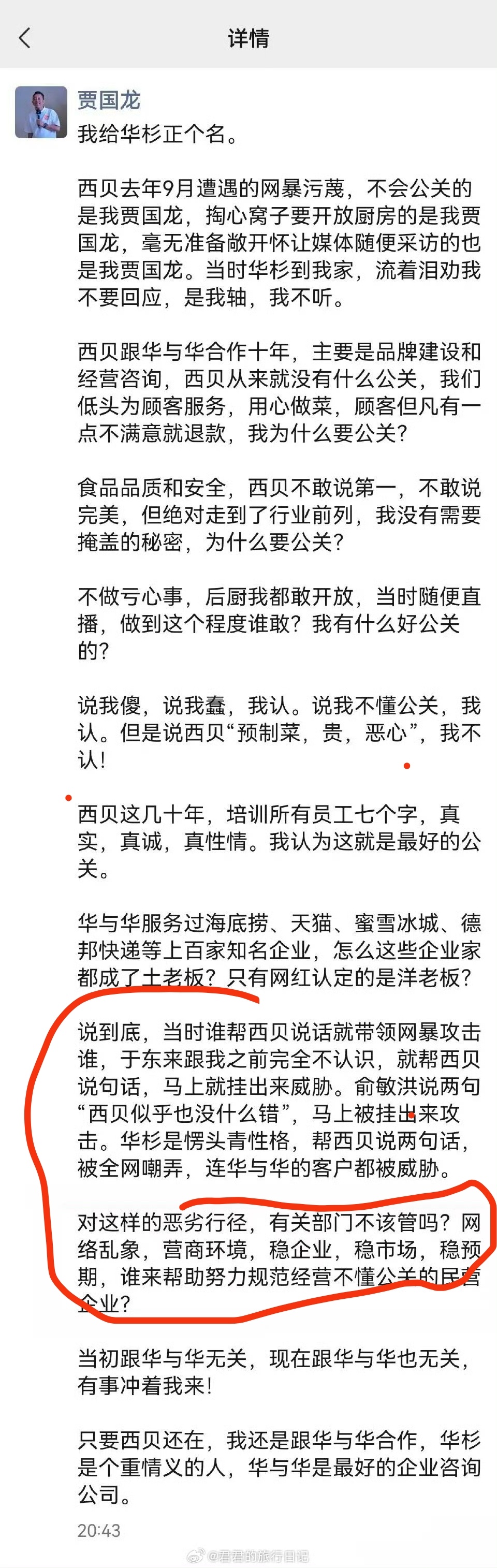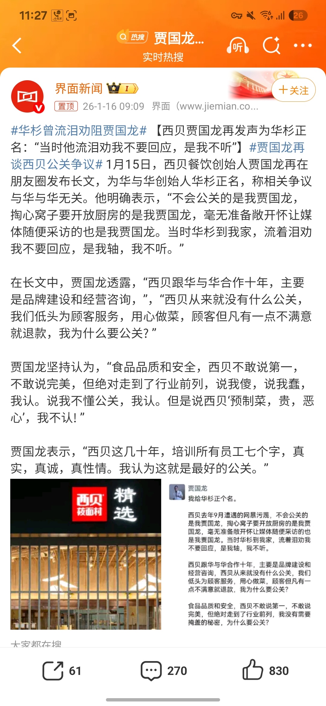 西贝和罗永浩的后续越来越精彩了西贝关店这么多家和 4000 多员工失业 之后贾国龙接下来的精力估计要开始对付罗永浩了网络黑嘴的定论估计马上出炉~华杉曾流泪劝阻贾国龙
