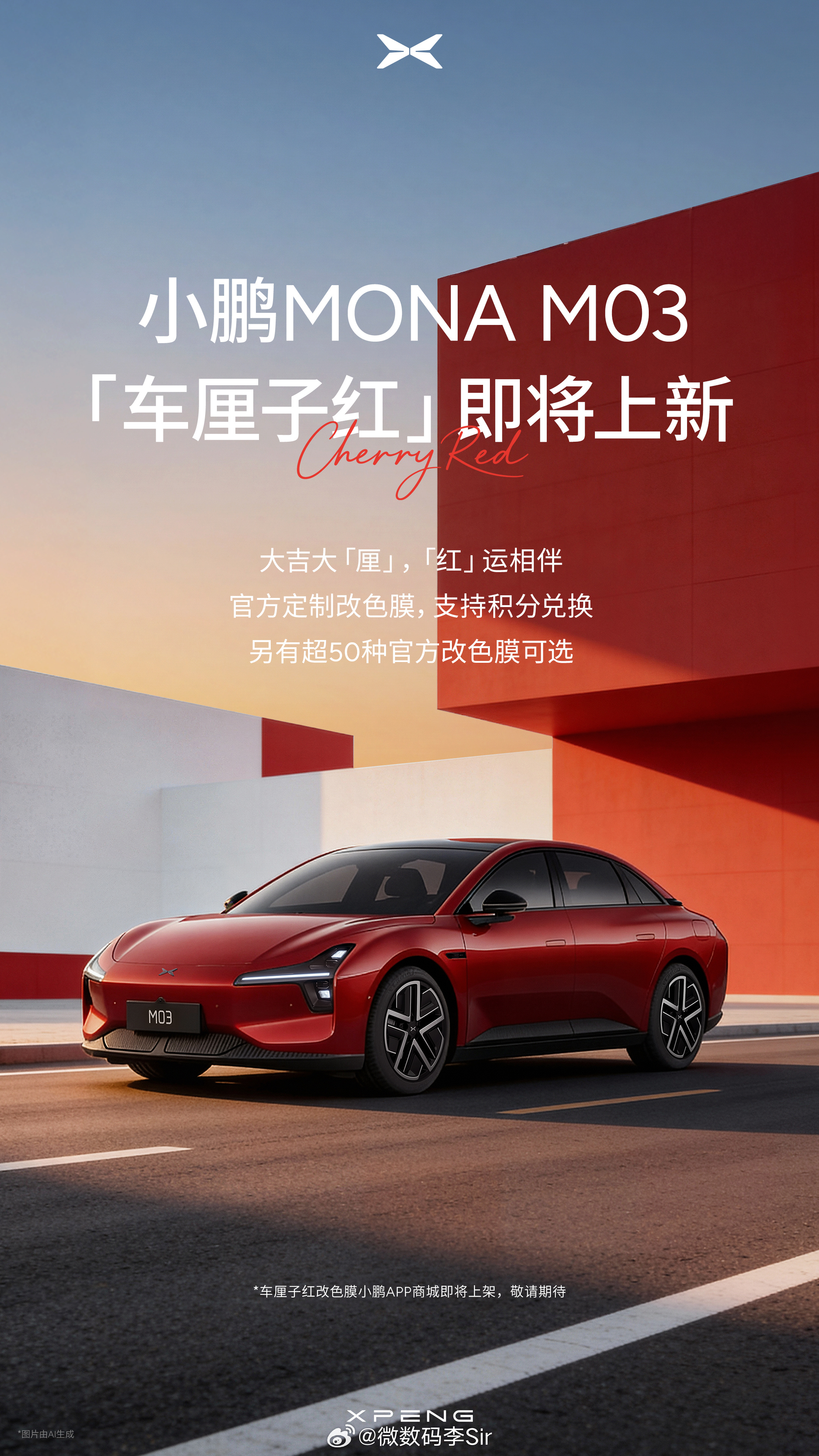 小鹏MONA新年战衣新年焕新色,小鹏MONA官方改色「车厘子红」即将上线!自带高级感的深邃红调,配合小鹏MONA黄金比例车身线条,轻松成为街头吸睛利器,让新年每一段旅程都充满高光时刻;作为年轻人钟爱的个性出行选择,小鹏 MONA M03本次官方改色支持积分兑换,不仅采用高品质改色膜材质,确保色彩纯正通透、贴合无瑕疵,更以 “车厘子红” 的吉祥寓意,为新年出行注入好运buff,鹏友们的车衣也能实现车厘子自由!小鹏MONA官方改色车厘子红即将上线