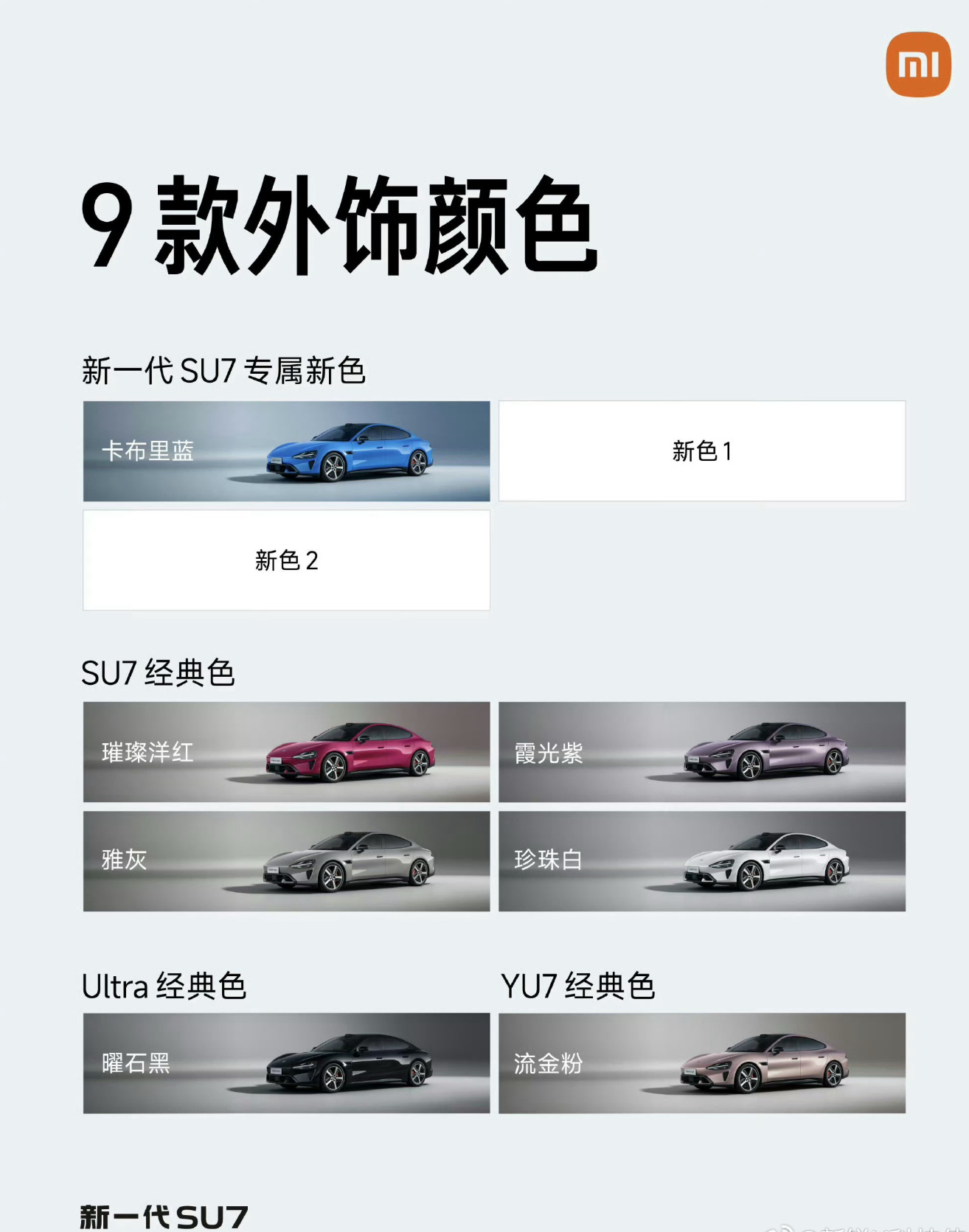 新一代小米SU7九款颜色公布 小米选色真的从没让人失望过!从手机到车,色调拿捏得死死的~ 新SU7主打的卡布里蓝太绝了,低调不扎眼还满是高级感,配着本身经典耐看的线条,质感直接拉满!之前霞光紫、鹦鹉绿全是爆款,这次九款颜色覆盖主流色系,明显做过调研,闭眼选不踩雷~ 底子好+颜色加分,这波妥妥又是要卖爆的节奏,狠狠期待了!