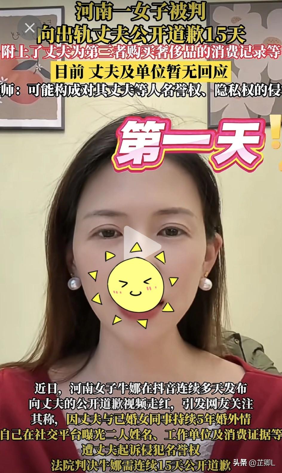 法院判决原配给出轨丈夫道歉15天,结果原配靠D音把渣男捶爆了!全网准时催更这场“道歉连续剧”! 河南,有一位女子娜姐,发现自己的老公高某跟同事搞婚外情,一搞还就是五年。 简直是士可忍孰不可忍! 娜姐一气之下,把俩人名字、单位、消费记录全挂网上了。结果,渣男居然反手一个起诉,说她侵犯名誉权! 法院判了:娜姐得连续15天在社交平台公开道歉。 不得不说,这事虽然娜姐是弱势一方,但也确确实实侵犯了渣男渣女的名誉权,娜姐愿赌服输! 所以,从1月12日起,真就每天准时发“道歉视频”。 但点开一看——好家伙!这哪是道歉,简直是出轨证据发布会!今天晒奢侈品消费单,明天讲家暴细节,视频点赞直接飙到50万+! 网友都乐疯了,评论区秒变“复仇指挥部”:“姐,道歉要诚恳!把他单位、全名都写上啊!” 娜姐从善如流,下条视频立马补上:“对不起高*,耿村煤矿机电一队职工……”(这道歉简直是比通报批评还详细!) 现在全网都在追更,天天蹲她D音等“今日份道歉”。 有人调侃:“法院判给渣男一个公道,网友判给原配一片江山!”热搜上了好几轮,全是“这哪是道歉,这是铁锤递证据啊!” 虽然娜姐的行为非常解气,看的一众网友那是心潮澎湃、大呼过瘾。但也有律师表示担心:虽然判决没规定道歉内容,但透露隐私可能又侵权。 不过网友才不管:“渣男告一次,姐能再锤十五天!” 最新战况:娜姐已连续输出五天,渣男和单位至今没有任何回应。 有人开始赌:下一个视频会不会放出更猛的料?这场“道歉连续剧”,怕是还没到大结局! 不过呢,仔细想想,律师提醒的对:吃瓜一时爽,但现实遇事还是先咨询法律人士。为了渣男,把自己搭进去不值当的! 网络复仇有风险,操作需谨慎! 素材来源:新闻晨报,侵联删!