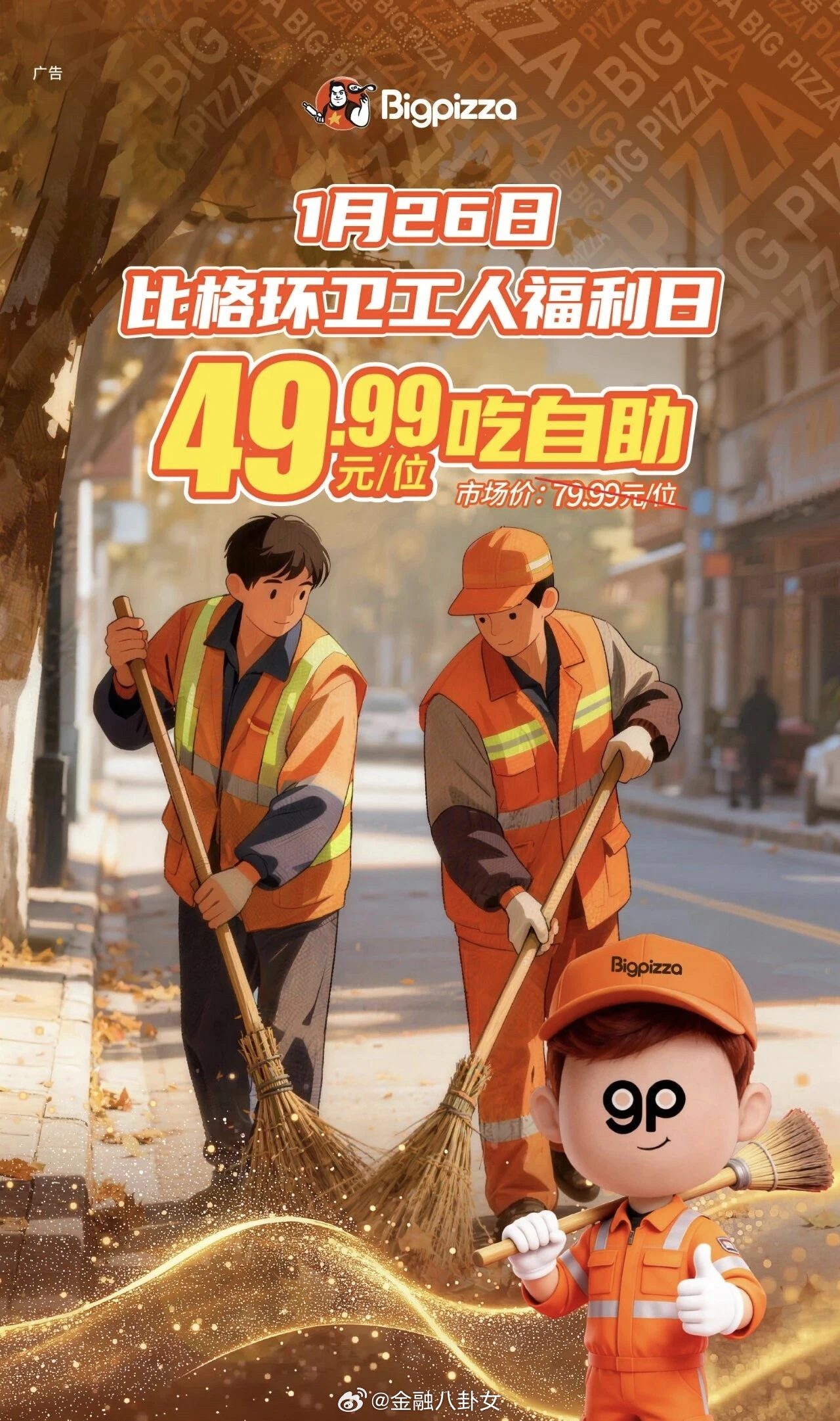 49.9元环卫工自助披萨引争议看了一下,这是比格每月的常规性活动,可享受优惠的人群包括律师、医护、厨师、骑手等,优惠价都是49.99元/人