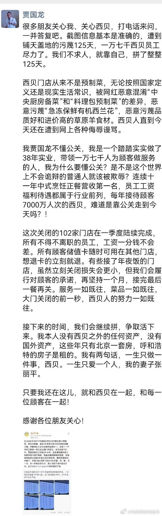 替贾国龙说句话 西贝关闭102家店,看到媒体圈还有人批评贾国龙不懂公关。我就纳闷了,搞餐饮的人就必须要变成公关达人吗?人家认认真真做餐饮,给消费者提供好的服务,解决员工就业,提供纳税,给供应链带来好多机会,这就完成了餐饮人的基本素养。如果一个社会环境逼迫搞餐饮的人必须变成公关达人,那是不是舆论环境有点问题?西贝至少是一家品质中上等的餐饮企业,把它一棒子打死,对公众有什么好处?对社会有什么好处?4000多人失业,4000个员工家庭失去了一大部分经济来源,上下游供应链失去了一个合作商,当地政府减少了一个税源,这就好吗?都批评贾国龙不懂公关,但是绝大多数中小企业都不是公关达人,对公关都不太清楚,他们的主要任务是做好产品,让用户满意。因为他们不太懂公关,就要遭受网络暴力和批评吗?那不就是被迫丢失主业搞副业吗?如果一个餐厅公关玩得特别溜,菜品不好,那是大家想要的吗?如果一个舆论环境逼着搞餐饮的人必须去学公关,那是不是舆论环境出了问题?西贝有预制菜,这个该批评,该标明。但是预制菜比它多的餐厅也有很多呀,有很多苍蝇馆子还在出售黑心饭菜呢?大家怎么不去批评这些,却去批评一家品质还不错的西贝呢!我反对预制菜,我希望预制菜能够标明,给顾客选择权,但是不能把公众对预制菜的怒火,都转嫁到西贝上,导致西贝关闭102家店。贾国龙说的网络暴力确实存在,因为网络暴力把公众对预制菜的怒火全转嫁到西贝一家身上,导致这家公司关闭这么多店。这本身就是一种不公平。预制菜的问题是全社会的问题。为什么让西贝一个企业来承担?我反对预制菜,我也认为贾国龙确实不擅长公关,但我认为西贝是一个品质还不错的餐厅。我非常反对网络暴力让这么一家品质中上乘的餐厅关门。这让消费者失去了一个好的就餐选择,更让4000个员工失业。那些批评贾国龙不懂公关的人,纯粹就是耍嘴皮子,站着说话不腰疼。没有干过实业,不懂得站在实业角度上看待这个事情。做餐饮懂公关更好,但是做餐饮不懂公关却给消费者提供了好的产品和服务,也值得肯定。不应该被网络暴力。如果一个品质还不错的餐厅,因为不会公关导致关门,那就是舆论环境的问题,不是餐饮人的问题。。西贝将关闭102家门店