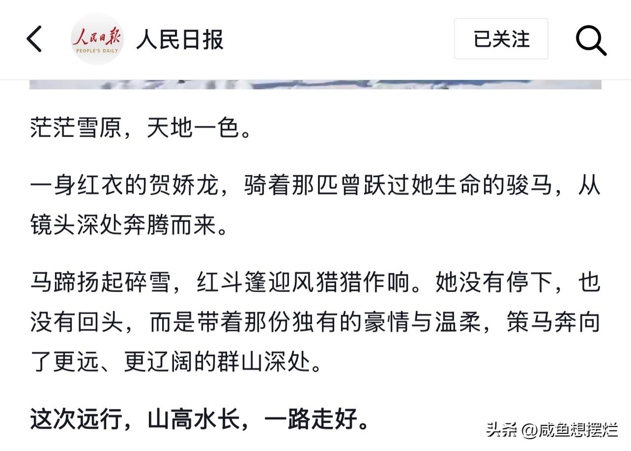 那就好好告个别吧! 今天,天还未亮,送别贺娇龙的车辆已在殡仪馆前排起长队,大家从四面八方赶来,只为送她最后一程。 一家花店已连续三次补货,打包到深夜,接到的订单来自全国各地。 她被人民捧得很高,她值得! 贺娇龙去世后,人民日报新华社等官媒同时发文缅怀,一位干部能赢得如此多的深情,不是没有理由的。 这份认可,来自于她对工作的付出和对人民的态度。 走红以后,她做了超过五百场直播,帮乡亲们卖出去的农特产价值超过六个亿。 光鲜背后,是外人看不到的辛苦和风险,2021年拍“天马浴河”时,她就曾连人带马摔进冰冷的河里,被救起来后头疼得厉害,却只是换匹马接着拍。 她对得起工作,却总觉得亏欠家人,连母亲的生日也常常缺席。 她说:只要是能把新疆的农产品推介出去,就算坠马也值得。 她说:我不是什么网红明星,我的身份永远是公职人员。 她说:用自己的辛苦指数换老百姓的幸福指数。 如今,这个满心都是老百姓的干部却倒在了工作岗位,直到最后一刻还在拼。 今天,不想再发您骑马的照片,红衣策马已远去,世间再无贺娇龙。 千言万语,不及人民日报一句话:此次远行,山高水长,一路走好!