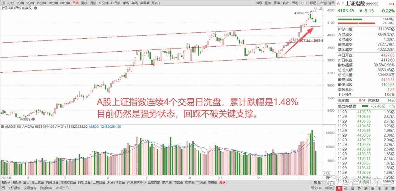 台积电业绩爆发,带动全球半导体股闻风而动,A股连续4天洗盘,珍惜倒车接人的机会。 1、台积电业绩爆发,带动美股科技股上涨 昨夜美股结束2连阴,开市恢复上涨,三大指数的涨幅分别为0.6%、0.25%、0.26%。一则消息带动半导体走强,引爆了AI行情:全球晶圆制造龙头台积电,四季度营收337.3亿美元,净利润同比增长35%,约160亿美元,毛利率升至62.3%,台积电股价上涨4.44%,带动美光科技、博通、英伟达、AMD等芯片股也纷纷跟涨。 2、中概股走弱,港股开盘跳水 昨夜美股中概股走弱,纳斯达克中国金龙指数逆势下跌0.6%。A50期指早盘9点30分冲高到1.1%附近以后开始跳水,午间横盘,抹掉了所有涨幅。今天亚太股市走势分化,日股和港股走弱,韩国和澳大利亚股市走强。香港恒生指数开盘一分钟涨幅达0.9%,随后快速跳水,午间微跌0.25%左右。 3、A股高开回落 A股上证指数早盘跟港股一样,9点32分冲高到涨幅0.62%以后迅速跳水,午间微跌0.22%,收在4102点。目前A股已经是连续第四个交易日洗盘了,累计跌幅达1.48%,仍然稳在10日线上方。今天下跌力度减缓,午间收盘深证成指和创业板指分别微跌0.1%和0.01%,科创50指数逆势上涨0.48%。 4、上午成交额达1.99万亿! 虽然是洗盘,但是市场情绪还是火热,上午2小时成交额高达1.99万亿,比昨天上午放量1171亿,如果下午稳住,那么全天突破3万亿问题不大。上午各大指数中,仅有科创板走势不错,其它指数小幅回踩,两市个股涨少跌多,2049只上涨,仅3312只下跌。 5、半导体强势,AI应用回落 半导体板块今天表现强势,一是因为美股市场台积电业绩爆发,全球半导体晶圆制造方向基本面走好,带动A股上涨;二是央行昨夜定向降息25基点,且将科技创新和技术改造再贷款额度从8000亿元,增加至1.2万亿元,利好科创和半导体赛道。AI应用方向集体回落,是因为短期涨幅过大,一些板块恰恰是倒车接人的机会! 综上所述,目前春季躁动行情从2026年开年至今,在年前一波急拉以后,进入中场休息的休整状态,这次空中加油结束以后,后续涨幅仍然未结束。珍惜这一波倒车接人的机会,把握春节之前的红包行情机遇。
