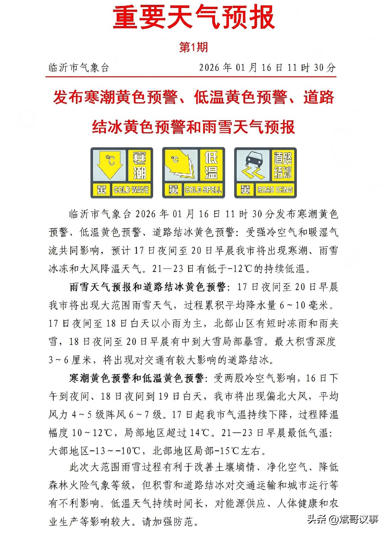 -15℃!😱临沂将迎持续超低温,先雨后雪,路上小心暗冰… 市气象台刚刚接连发布了三个黄色预警,这意味着接下来几天的天气会非常复杂、非常寒冷,需要我们每个人认真对待。 一、最需要关注的事:持续低温 这次不是简单地冷一两天。从21日到23日(下周初),全市大部分地区早晨的最低气温会降到-10℃到-13℃,北部山区甚至可能达到-15℃左右。 这种低温会连续好几天,对家里的水管、暖气、甚至身体健康都是很大的考验。 二、雨雪怎么下?关键在“转化” 雨雪过程分两步,大家要特别小心路上的危险: 1. 第一步:先下雨(17日夜里到18日白天) 全市主要是小雨,但北部山区(比如蒙阴等地)会有冻雨或雨夹雪。这比下雪更麻烦——雨水落地就结冰,在路上形成一层看不见的“暗冰”,开车、走路特别容易打滑,是这次天气里最初的,也是最容易被忽视的危险。 2. 第二步:后转雪(18日夜里到20日早晨) 雨会转成雪,预计有中到大雪,局部雪量很大。地面会积起一层雪。麻烦在于,雪下完后,气温会暴跌,积雪来不及化就会冻成冰。所以周一早上,全市的道路结冰情况会非常普遍,出门上班上学,一定要预留出大量时间。 三、风大,会觉得更冷 这次冷空气来的时候,风也很大,平均有4-5级,阵风能达到6-7级。风吹在脸上,体感温度会比天气预报的数字还要低好几度,出门一定要裹严实。 四、给大家的几点实在建议 ☞ 开车出门的朋友:务必提前换好防冻玻璃水,检查轮胎。周一早上出门前,先试探一下刹车。路上一定要慢,和前车保持比平时远得多的距离。 ☞ 家里有老人孩子的:极端低温容易引发心脑血管疾病,这几天早晚尽量别让老人出门。检查一下家里的取暖设备是否安全,备用药物是否充足。 ☞ 所有人今晚可以做的事:检查一下家里阳台和厨房的水管,用旧衣服或保温材料包一下。把手机、充电宝都充满电。 这次天气过程,对净化空气、缓解干旱有好处,但眼下更重要的是安全。充分的准备,能帮我们和家人平安、顺利地度过这段时间。 大家还有什么具体担心或准备措施吗? 你是担心周一怎么上班,还是惦记老家大棚里的作物?或者已经准备好了应对方案?欢迎在评论区聊聊,你的经验或许能帮到别人。 请把这条提醒,转发给你在临沂的家人和朋友,特别是经常开车或独自居住的亲友。互相提醒,平平安安! 山东天气 临沂天气 天气预警 断崖式降温 寒潮来袭雨雪天气 暴雪预警 防寒保暖 道路结冰 出行安全 (提示:天气情况仍有变化可能,请随时关注官方发布的最新天气预报。)