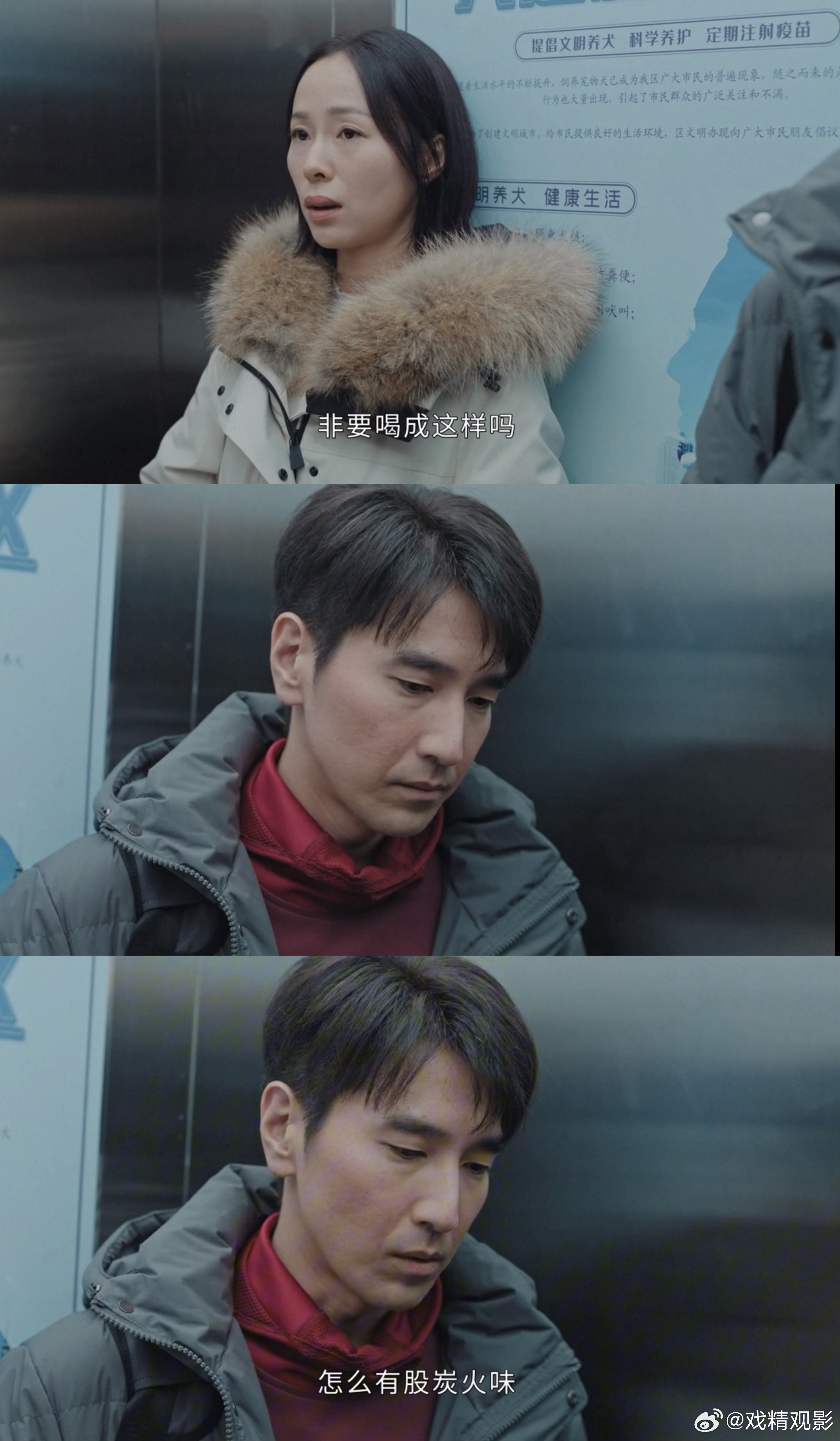 你身上有他的烧烤味是我鼻子犯的罪 电梯里貌合神离的夫妻相遇,妻子还在指责丈夫喝酒。殊不知丈夫早已察觉异常,一句炭火味的质问直接戳破了谎言。
