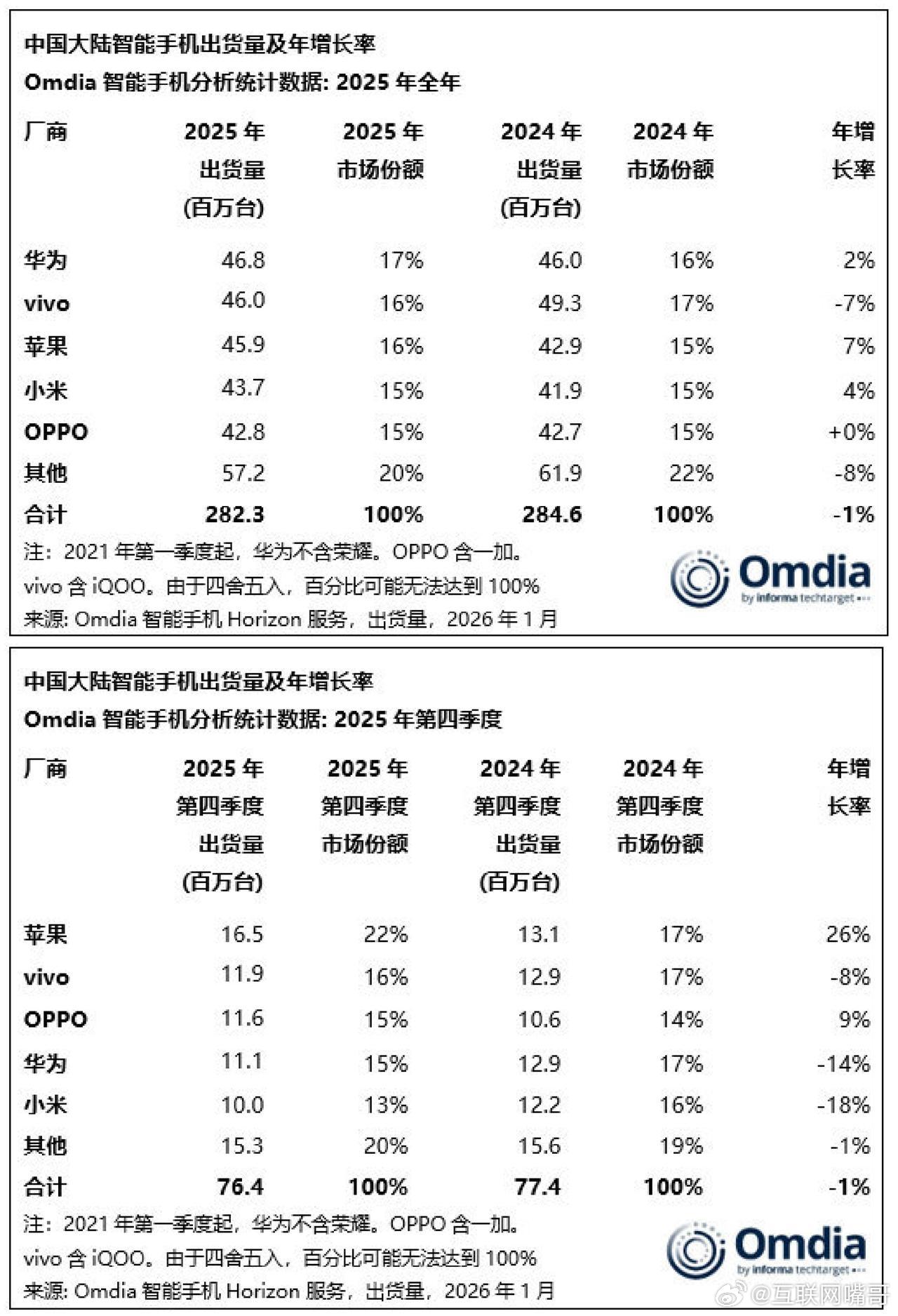 根据Omdia统计报告显示,华为以4680万台的出货量重回国内市场第一,占据了17%的市场份额!在芯片产能持续受限、鸿蒙生态尚处阵痛期的双重挑战下,终于回到了榜首位置——时隔五年后,华为在2025年再次成为中国市场全年出货量第一的手机厂商!