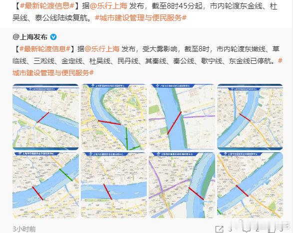 上海市内轮渡线陆续复航 上海市大雾黄色预警信号解除,据发布,截至8时45分起,市内轮渡东金线、杜吴线、泰公线陆续复航。(cr)