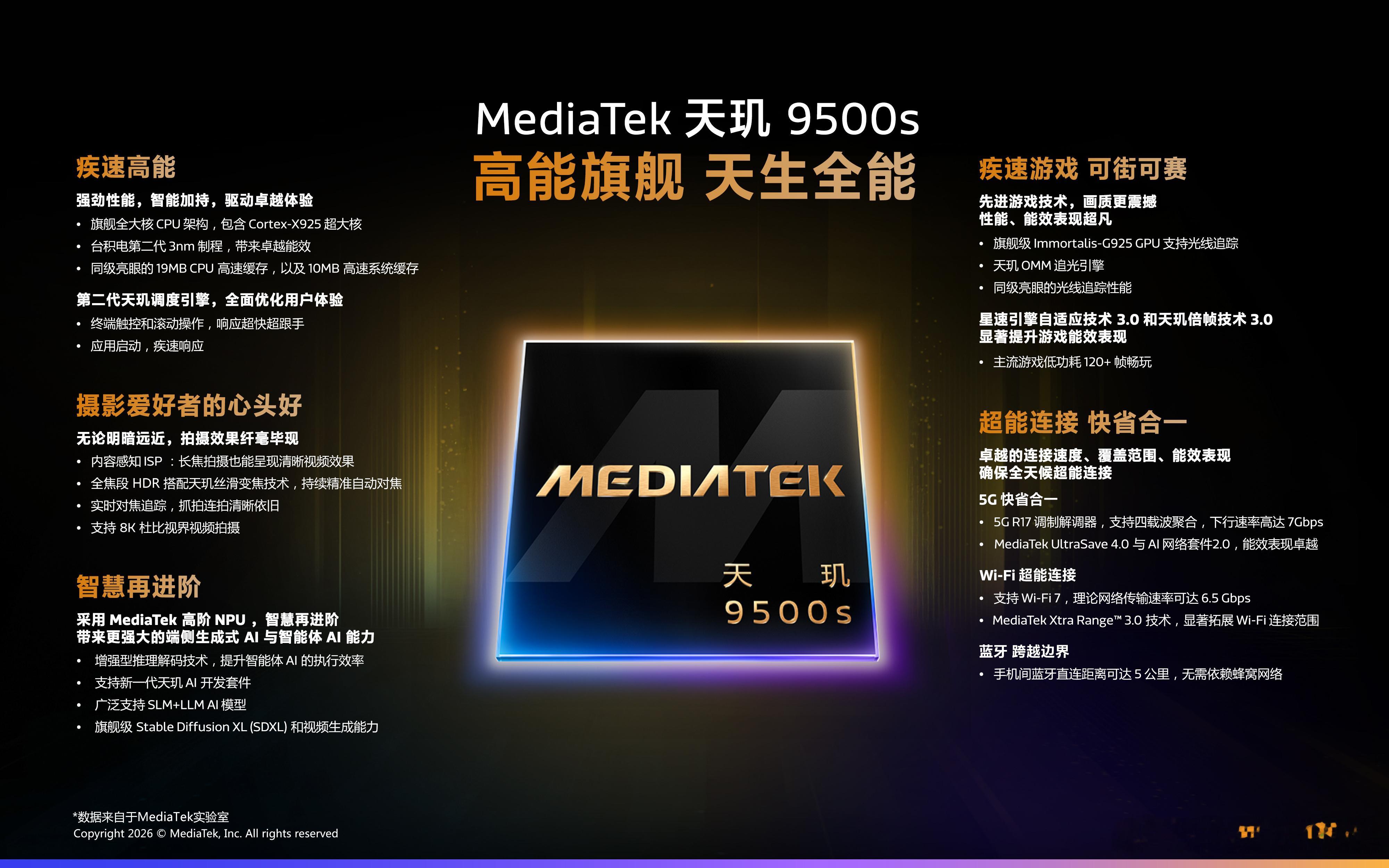 一张图看懂天玑9500s!采用旗舰3nm制程和全大核架构,八核CPU包含 1 个主频高达3.73GHz 的 Cortex-X925 超大核,以及 3 个 Cortex-X4 超大核和 4 个 Cortex-A720 大核。