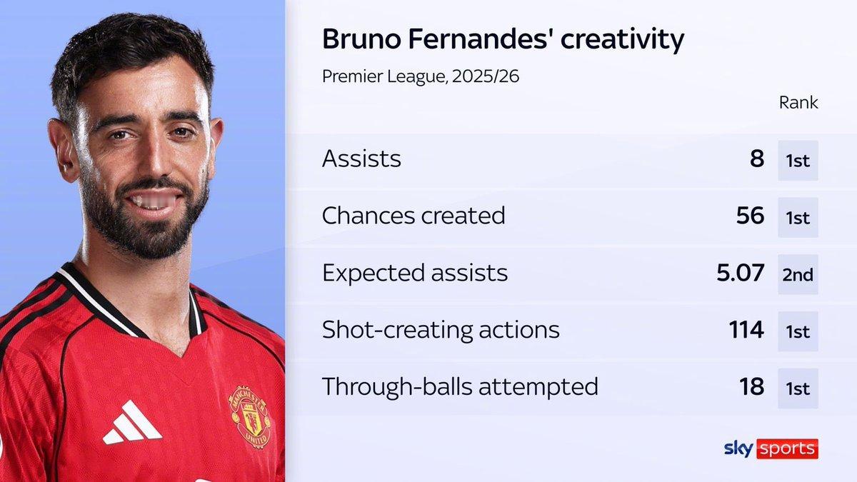 📊 布鲁诺·费尔南德斯本赛季在英超联赛中的创造力数据。消息源:Sky曼联 布鲁诺·费尔南德斯