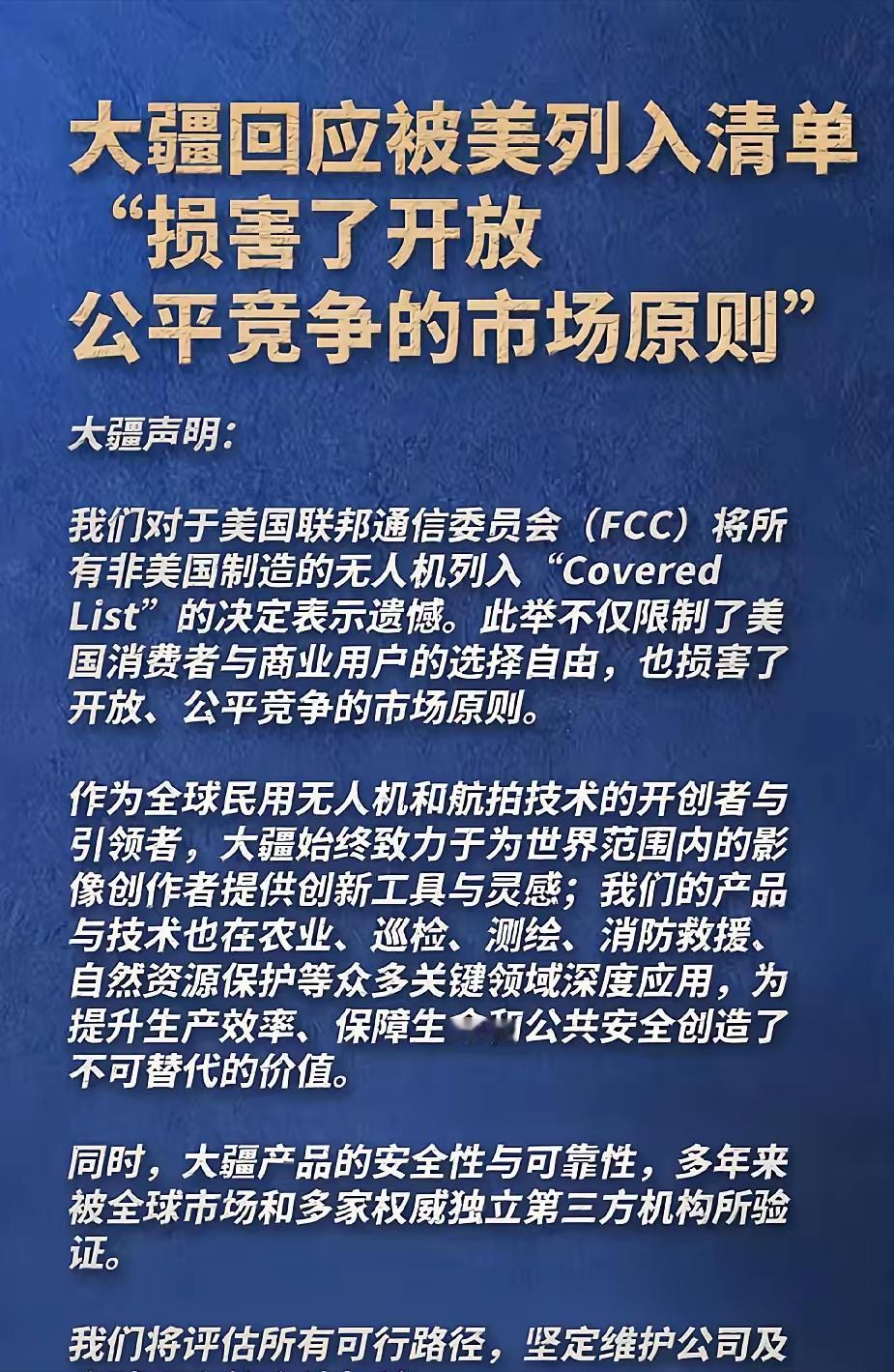 伤害性极大!侮辱性更强!说出来大家可能不信,有这么一家中国公司,被美国列进实体清单、下过采购禁令、还被污蔑“威胁安全”,结果人家不仅没垮,反而越做越大,2024年营收直接冲到800亿,净利润120亿! 这就是大疆,跟华为一样,堪称美国“打压式培养”的典范——老美越是围追堵截,咱们中国科技企业就越是斗志昂扬,这种“伤害性极大,侮辱性更强”的现实,真是把美国的霸权套路按在地上摩擦。 先看看大疆这组让人拍案叫绝的数据:2015年营收才59.8亿,净利润14.2亿;短短九年时间,营收翻了13倍多,净利润飙到120亿,年均增长速度让多少跨国巨头望尘莫及。 要知道,这可不是在顺风顺水的环境里成长起来的,从2017年开始,美国就没断过对大疆的打压。 先是国防部以“网络安全”为由,下令部队停止采购和使用大疆无人机; 2020年12月,直接把大疆列入出口管制“实体清单”,禁止美国企业向大疆出售相关技术和零部件; 2025年10月,还想搞个限制中国无人机进口的提案,结果折腾了三个月,今年1月8日又悄悄撤回了 。 老美这波操作真是让人看笑了,一边喊着“国家安全”的口号处处设卡,一边身体却诚实得很。 美国无人机数据保护联盟2025年8月提交的报告显示,2024年美国注册的无人机里,大疆的市场份额高达90%,远超其他所有品牌。 更讽刺的是,被美国国防部明令禁止采购后,美军自己却偷偷买了不少——2018年美国海军和空军就花了20多万美元,给“海豹”突击队这类精锐部队采购大疆无人机; 2024年9月,美国国防部官网还主动曝光,美军在演习中用大疆经纬M350 RTK无人机,说它发挥了“至关重要的作用” 。 这是“威胁安全”?分明是离不开啊! 为啥美国一边制裁一边又离不开? 答案很简单:自己造不出来,还没人能替代。 第三方机构数据显示,大疆无人机的采购成本只有美国同类机型的25%到35%,但性能却强出一截——续航时间更长、操控更精准、画质更清晰,从农业植保、影视航拍,到基建巡检、消防救援,各行各业都能用。 美国不是没试过扶持本土企业,可折腾了九年,本土无人机产量只占全球的6%,连合格的技术工人都缺,很多所谓的“美国制造”无人机,核心零部件还是中国产的 。 2024年美国想对中国无人机加征高额关税,结果呢? 大疆在美国的市场份额不仅没降,还从65%涨到了67%,反过来证明了“谁好谁坏,市场说了算”。 再看看跟大疆齐名的华为,更是美国“打压式培养”的标杆。从芯片断供到市场封锁,从联合盟友禁用5G设备到列入实体清单,美国能用的招儿几乎都用了。 结果呢?华为不仅推出了自研的鸿蒙系统,突破了芯片制造的关键技术,2024年的营收也重回增长轨道,5G专利数量全球第一,高端手机市场份额稳步回升。 大疆和华为用实际行动证明了一个道理:中国科技企业最怕的不是外部打压,而是没有压力;美国的制裁看似来势汹汹,实则成了中国企业自主创新的“催化剂”,逼着我们摆脱对国外技术的依赖,走出一条属于自己的硬核之路。 有人可能会问,大疆被列入实体清单,就没受一点影响吗? 肯定有,但影响有限。 一方面,大疆早就布局了供应链自主化,核心零部件大多实现了国产替代,美国的技术封锁根本卡不住脖子; 另一方面,全球市场那么大,美国不是唯一的选择。 欧洲、东南亚、非洲的国家都抢着要大疆无人机,用它来搞农业现代化、改善基础设施、提升应急救援能力。 就算美国市场份额降一点,其他市场也能轻松补上,这就是中国企业的全球化底气。 老美现在的心态其实很矛盾:既怕中国科技企业崛起,动摇它的技术霸权;又离不开中国的优质产品,担心制裁会反噬自己的经济。 就像这次撤回限制中国无人机进口的提案,根本原因就是美国国内反对声太大——近50万名注册无人机驾驶员,很多人靠大疆无人机创业谋生,一旦禁令实施,这些小企业根本无力承担转换供应商的成本,美国的低空经济发展也会被拖累 。 这说明什么?现在的世界早就不是美国说了算的时代了,搞单边制裁、贸易保护,最终只会搬起石头砸自己的脚。 说到底,美国对大疆、华为的打压,本质上是对中国发展的焦虑和恐惧。但历史的车轮只会向前,不会因为谁的阻挠而停下。 大疆用九年时间从59.8亿营收冲到800亿,华为在重重封锁中涅槃重生,这些都告诉我们:中国科技的崛起势不可挡,任何外部势力的打压,最终只会让我们变得更加强大。 希望更多中国科技企业能以大疆和华为为榜样,沉下心来搞研发,硬起腰杆闯市场,用技术实力说话,用市场成绩打脸那些看不起中国的人。