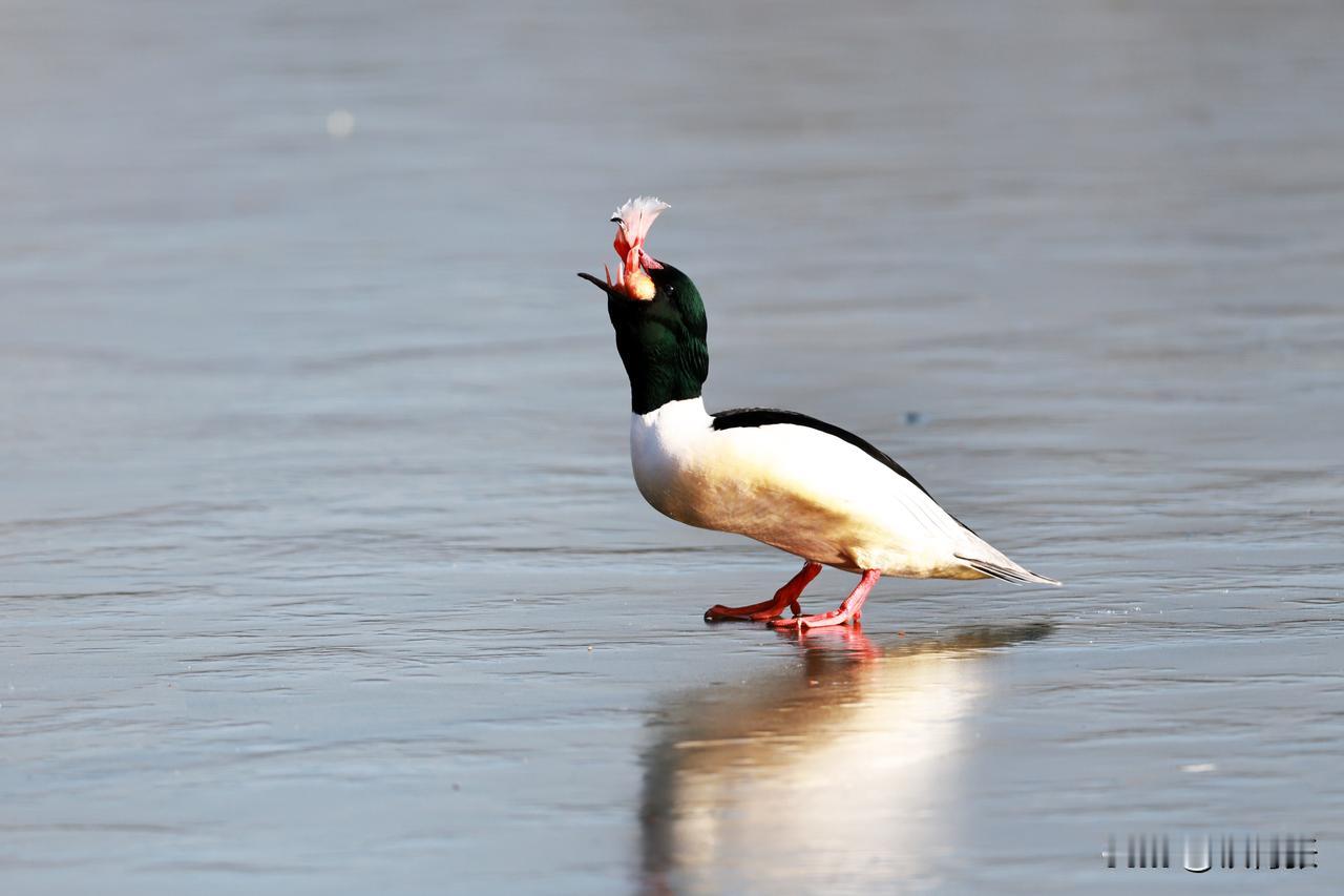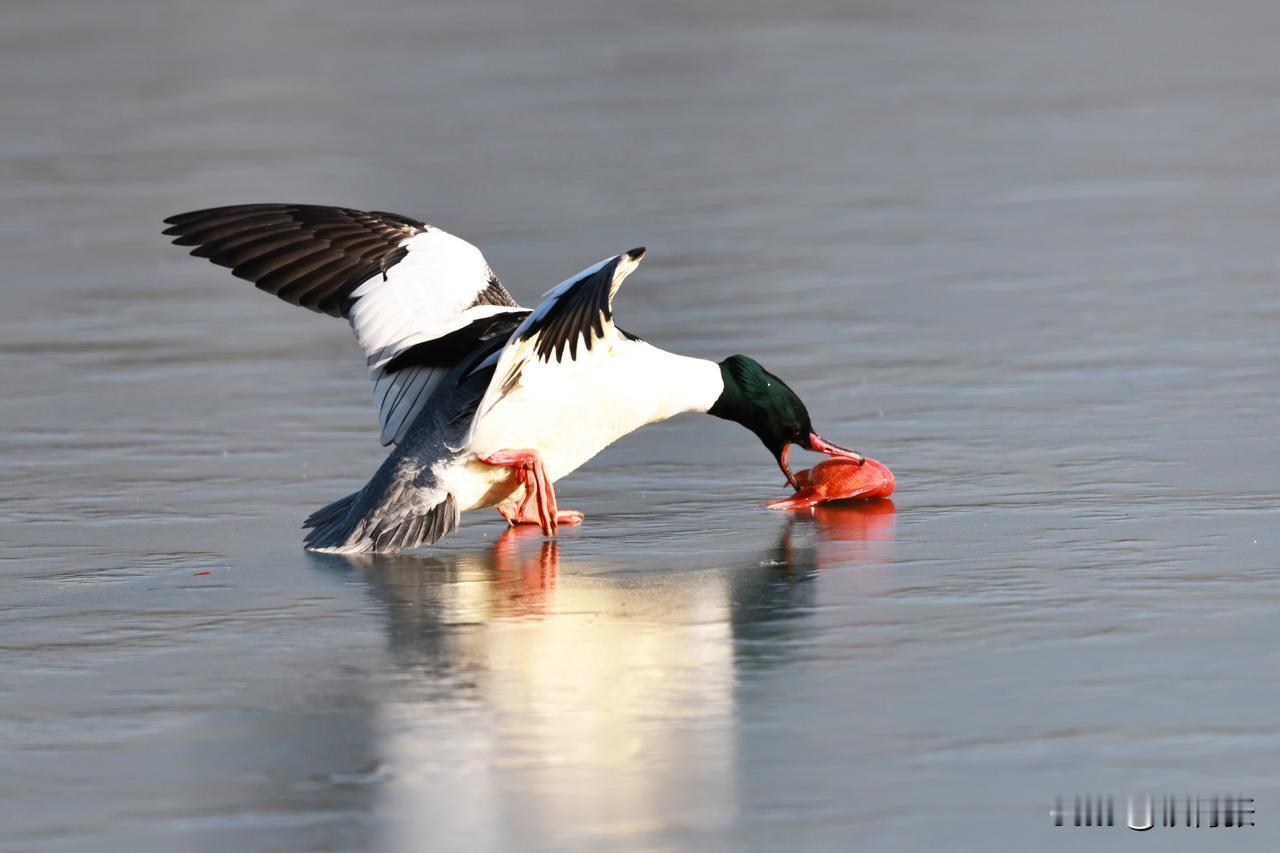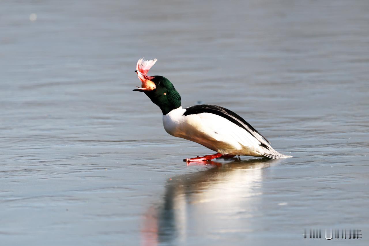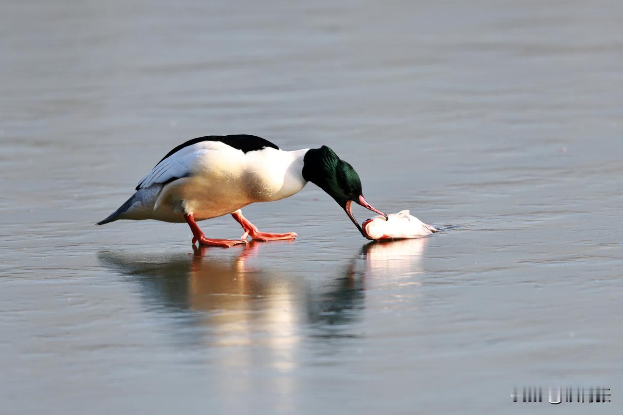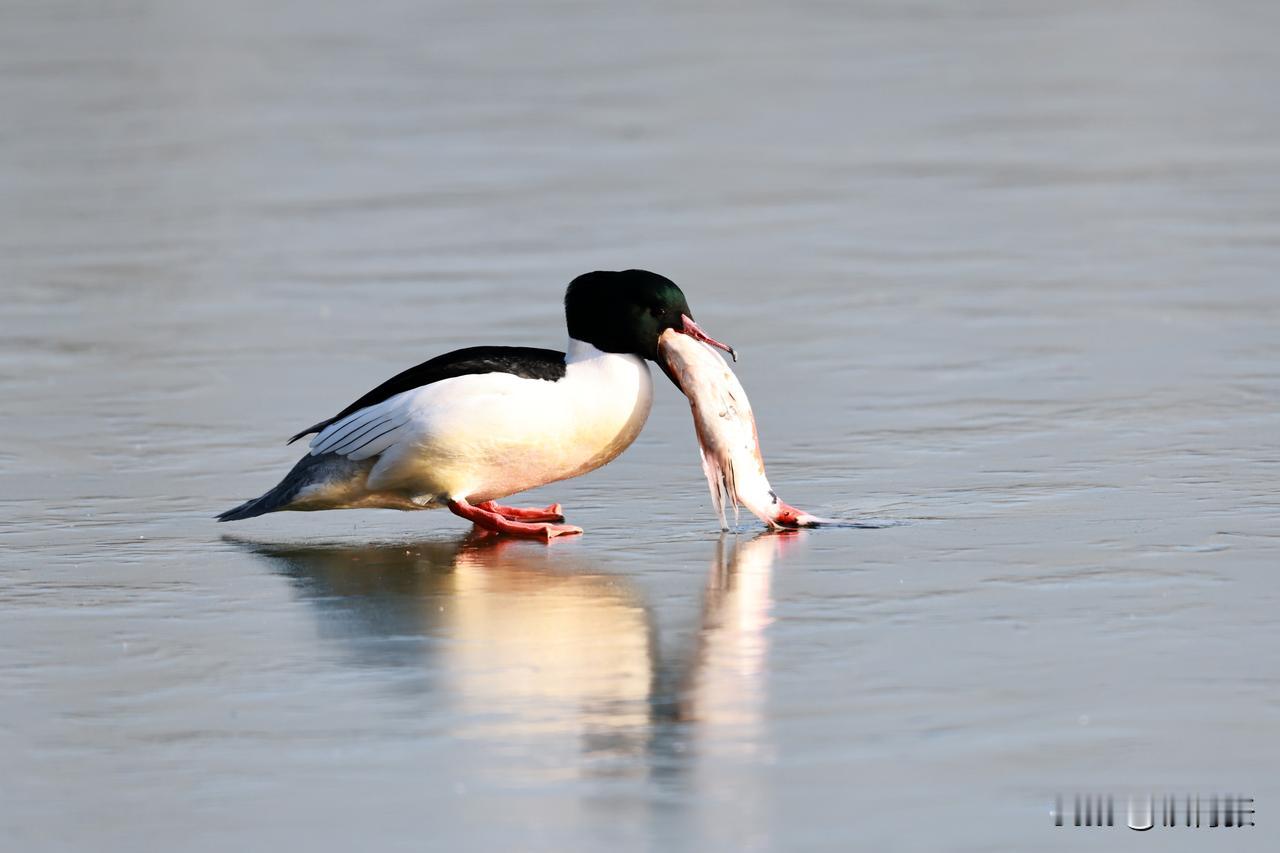 一只秋沙鸭在跑动过程中,泥鳅掉落,又失而复得。