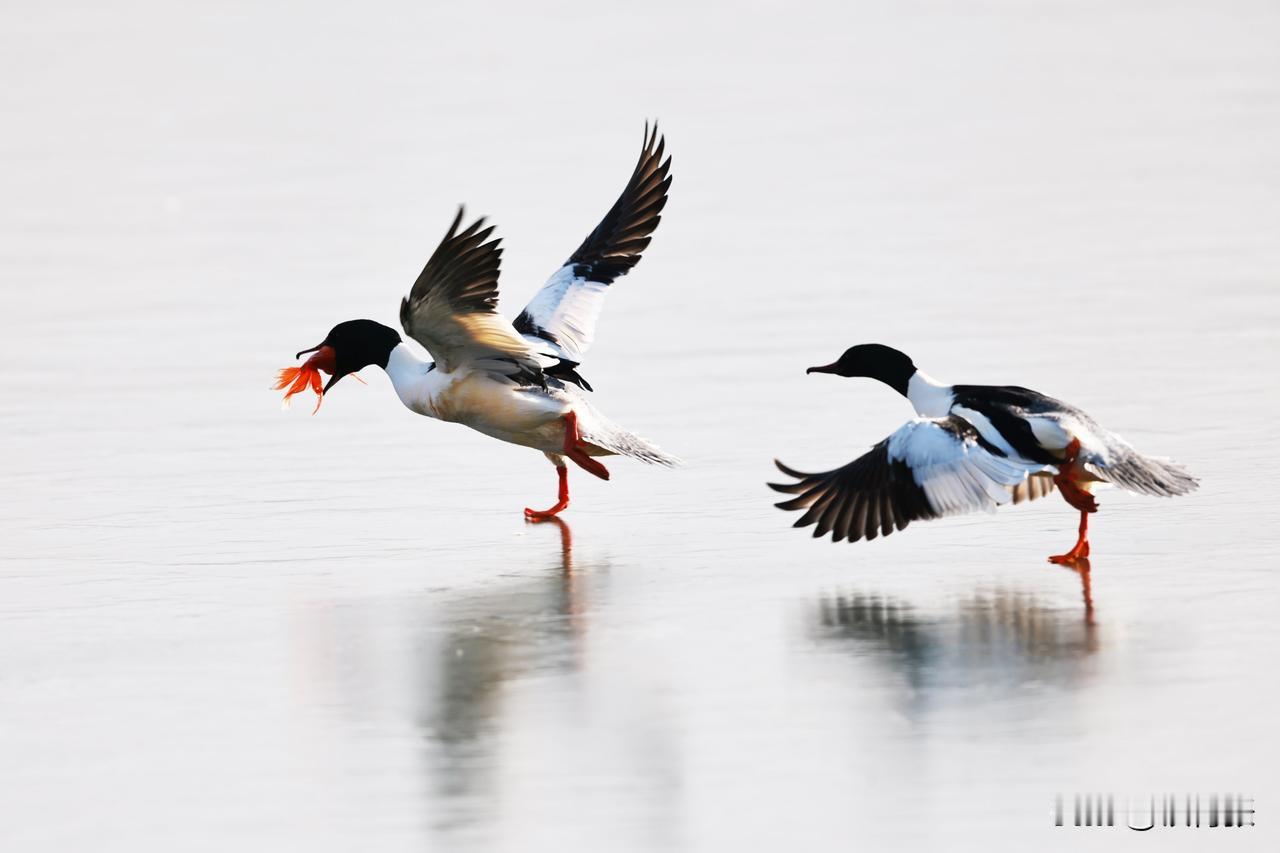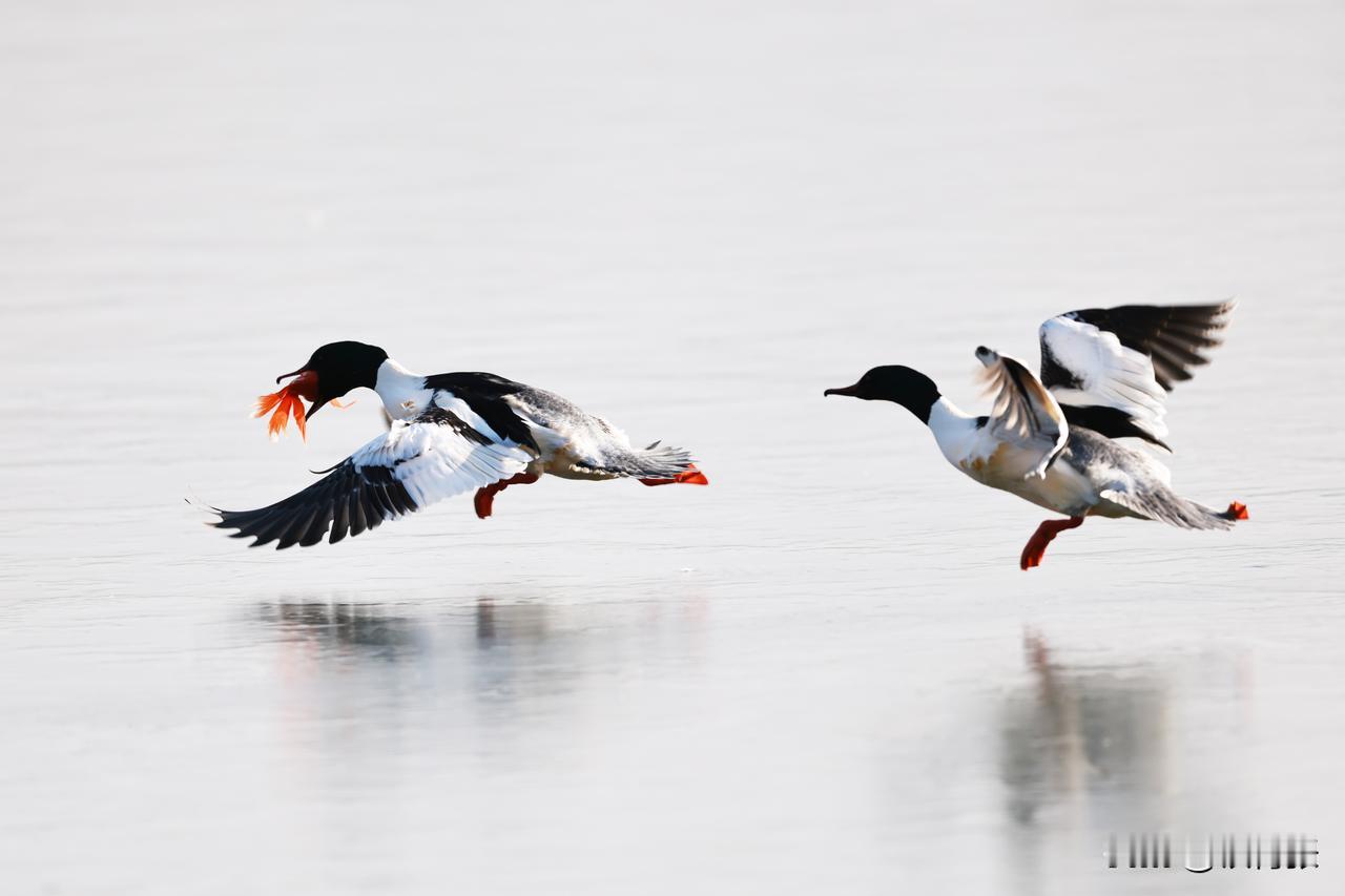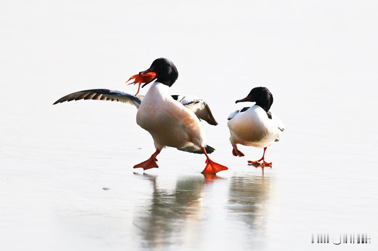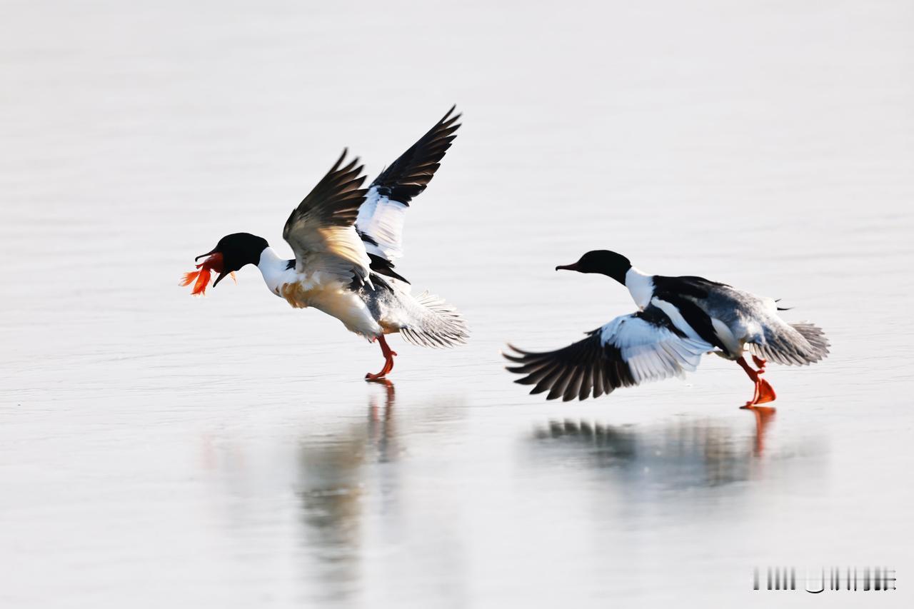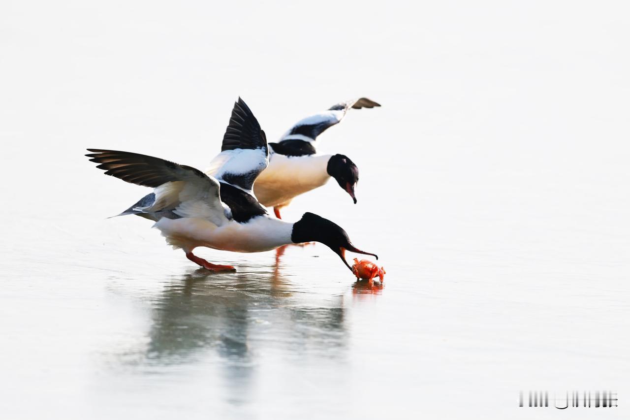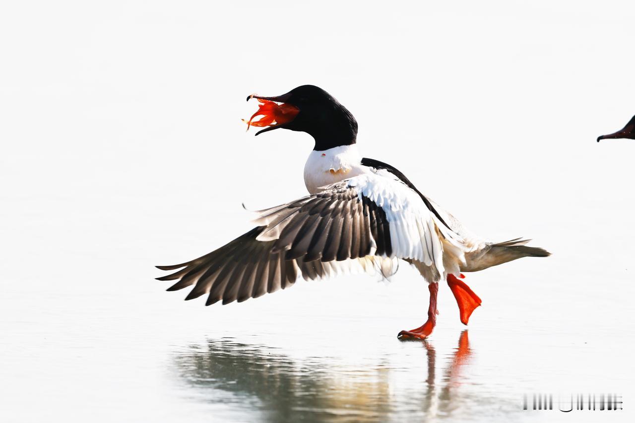 一只秋沙鸭在跑动过程中,泥鳅掉落,又失而复得。