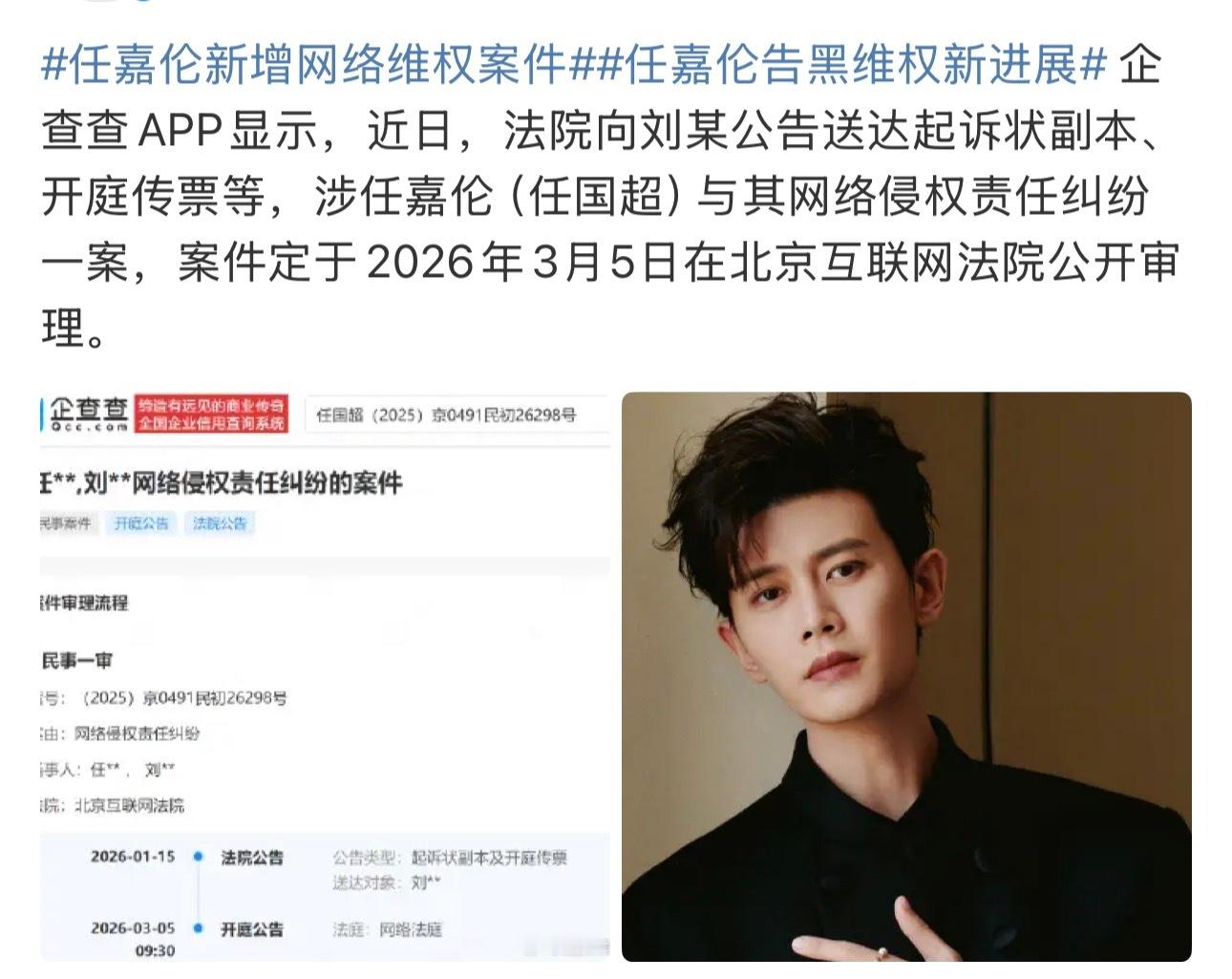 任嘉伦告黑最新进展即将开庭一个支持维权任嘉伦