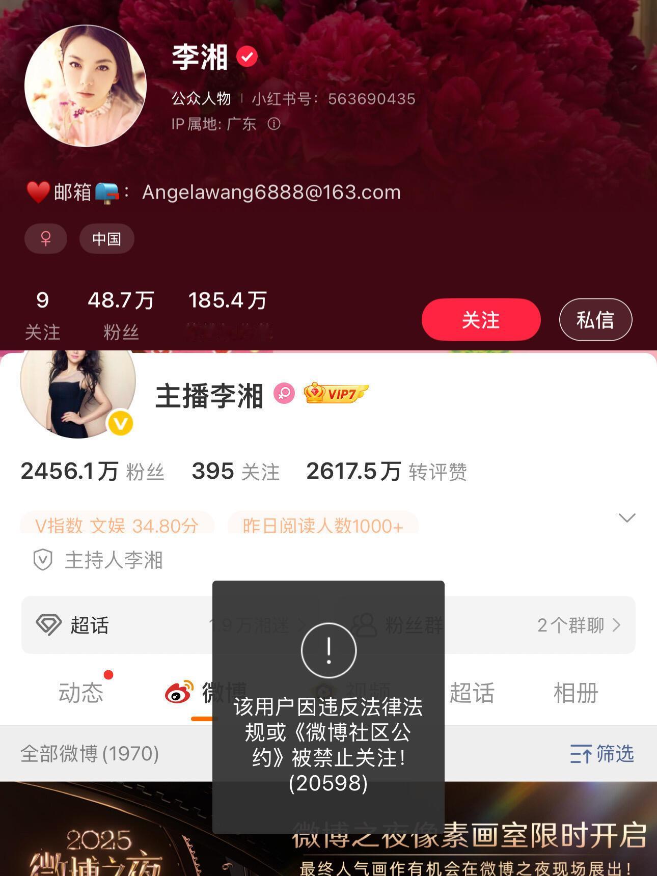 李湘为啥全平台账号都被禁止关注了微博、抖音、小红🍠都不行了,好多人说因为炫富,