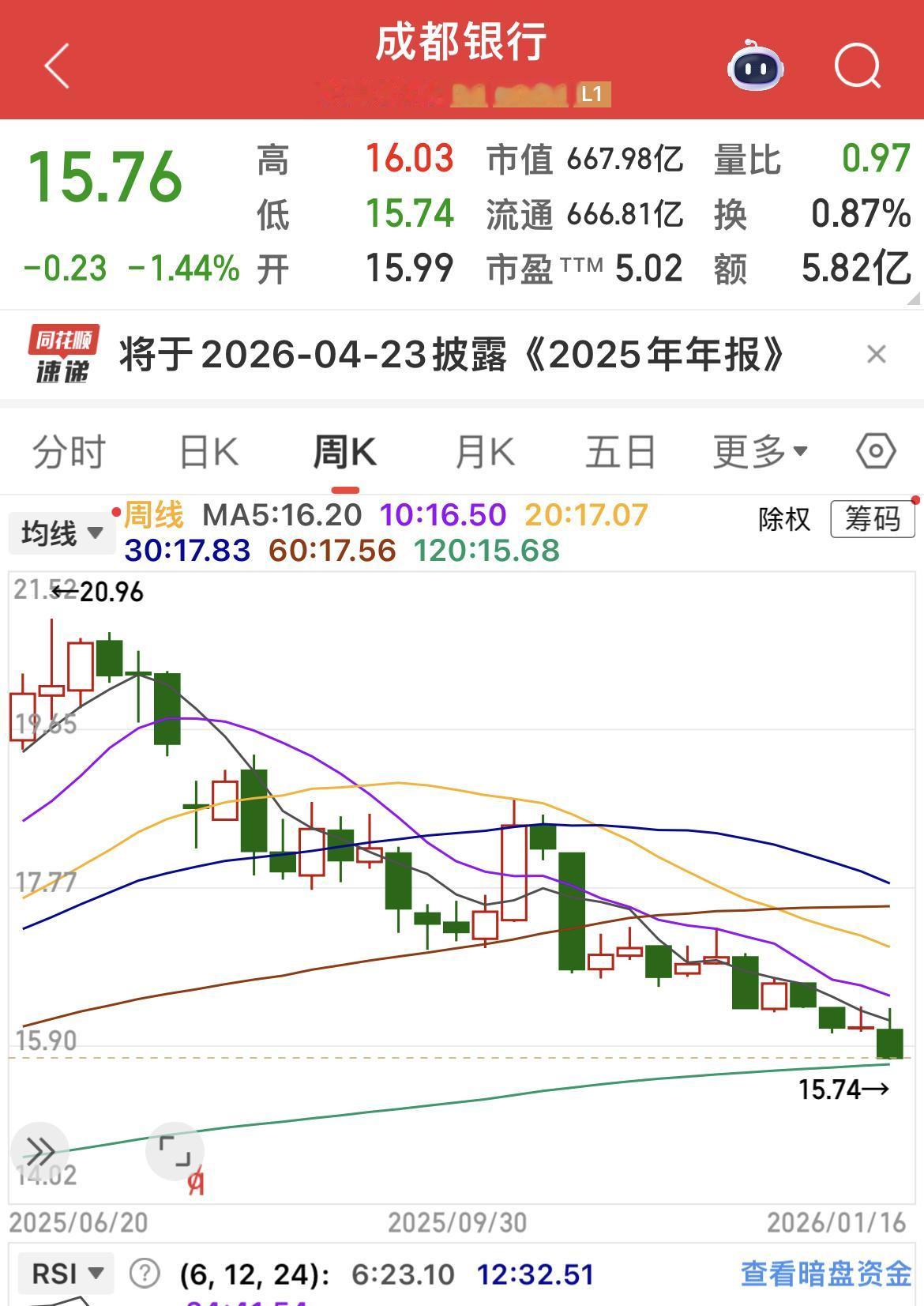 成都银行从去年7月份的高点20.96元跌到15.74元….. …………………………………… 市盈率(TTM):5.02倍 市净率:0.79倍 拨备覆盖率:443 % 不良贷款率:0.68 % 前三季净资产收益率:11.40 % 营收同比增长:3% 净利同比增长:5% ………………………………………. 银行股最重要的指标“股息率”:预计下一次股息率接近6%,排在42只银行股首位!