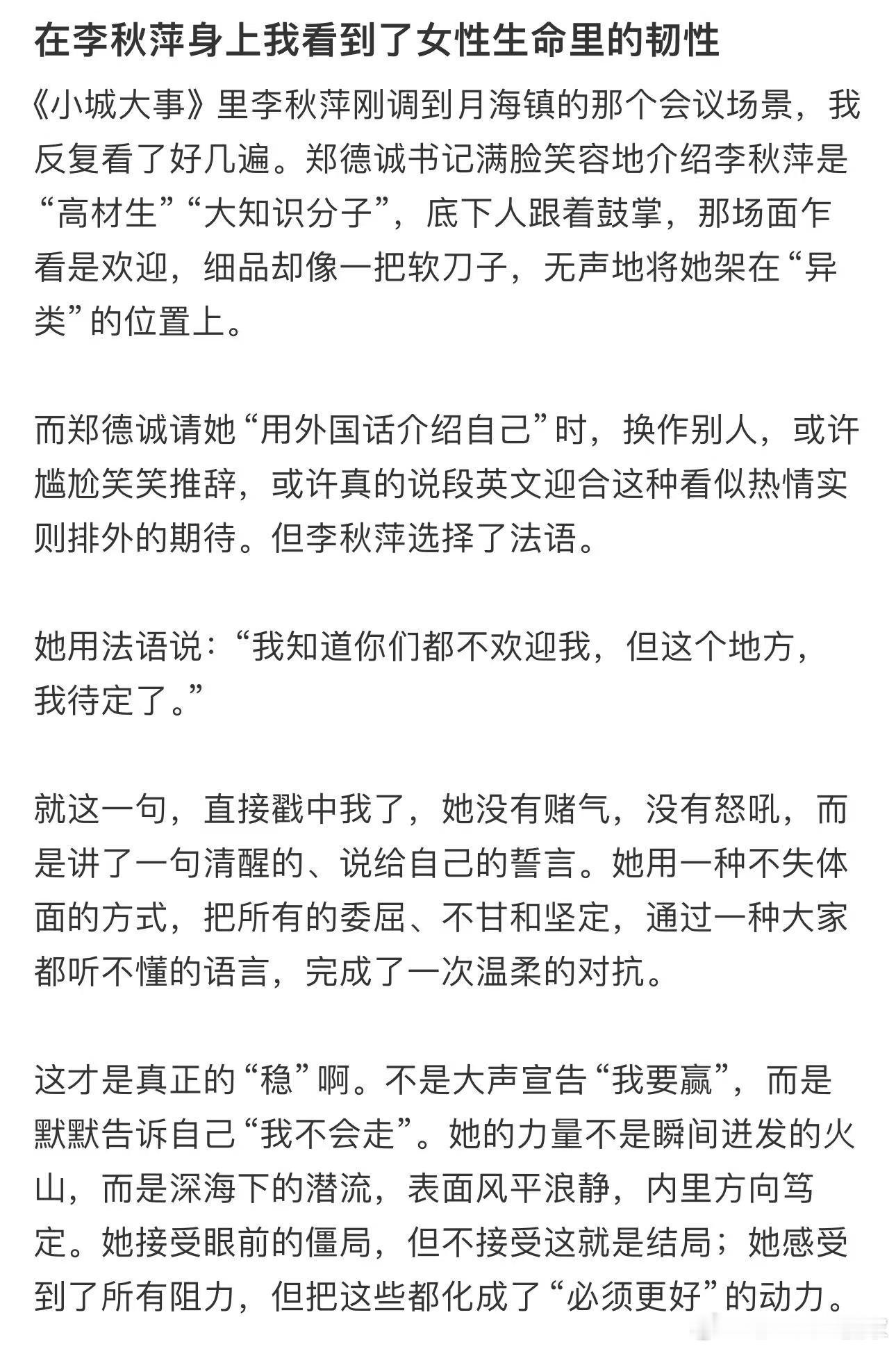 国产剧拍出职场女性生长痛 《小城大事》可贵地聚焦了女性在公共服务领域的成长。李秋萍所遭遇的,并非戏剧化的迫害,而是更具普遍性的职场冷启动与理念磨合之痛。她的选择令人敬佩:用最实在的劳动打破僵局,用最坚定的态度守护原则。在面对“劝退”这样的重大压力时,她表现出的不是对抗性的愤怒,而是建设性的沉稳。这体现了女性领导者一种独特的领导哲学——通过耐心、包容和不可动摇的韧性来实现改变。小城大事