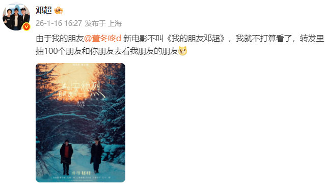 邓超给好友董子健新电影宣传邓超为董子健宣传新电影邓超为董子健宣传新电影《我的朋友安德烈》邓超说:由于我的朋友董子健新电影不叫《我的朋友邓超》,超哥就不打算看了!