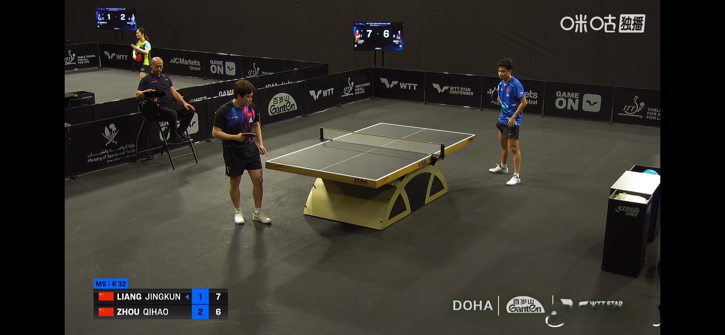 WTT球星挑战赛多哈站2026 男单1/16决赛:🇨🇳周启豪3比2梁靖崑🇨🇳(11-5,11-8,9-11,6-11,11-8)