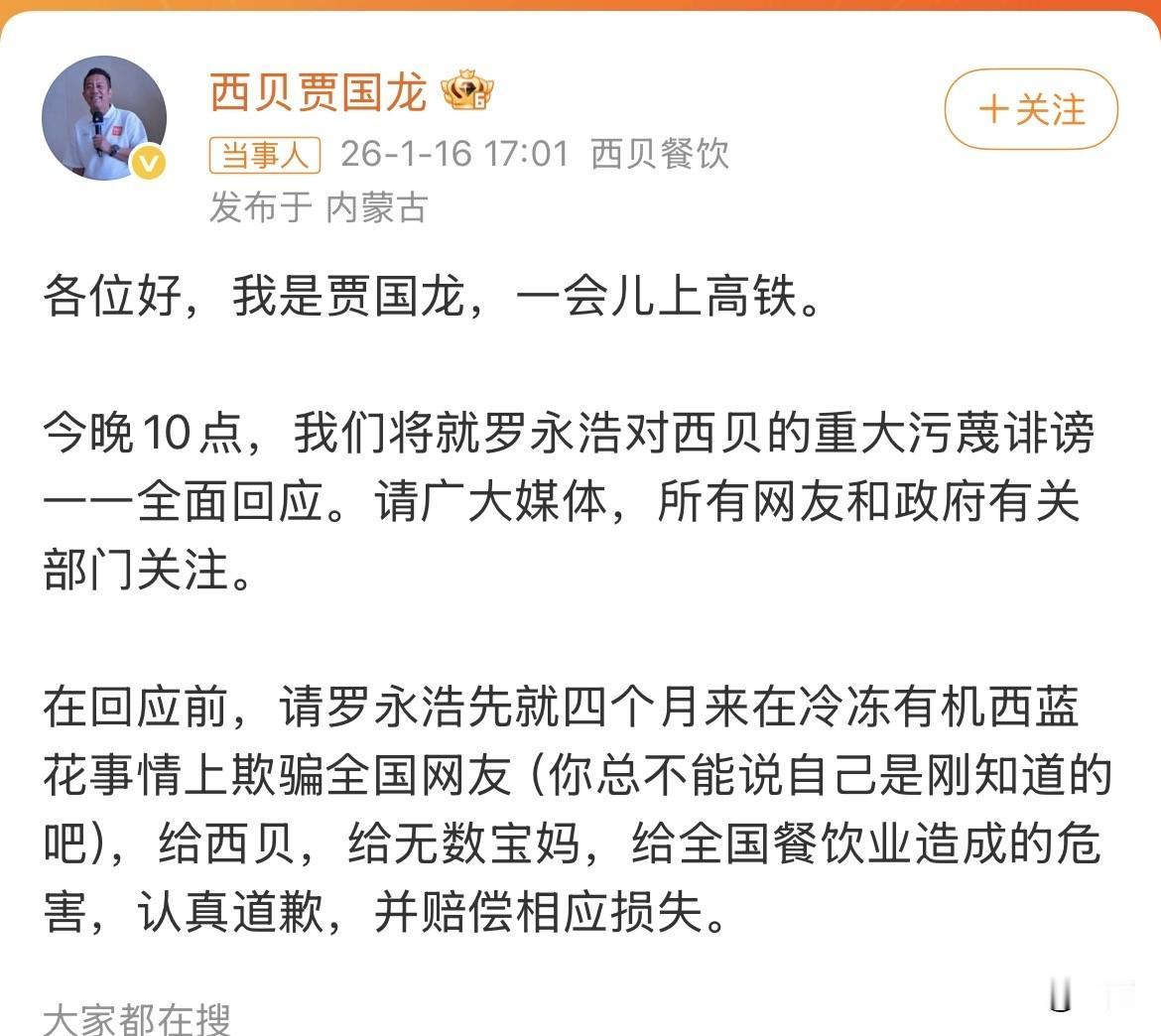 贾国龙: 今晚10点全面回应! 就在刚才,贾国荣在社交网络上发出了两串简短的文字,意思就是现在正在高铁上面,但是这个事儿,在他心里面应该憋了几个月了,所以他定了一个时间,今天晚上10:00估计到时候他的高铁已经到站了,然后他会选择一个地方进行全面的回应。 这段文字当中他也特别提到了罗永浩,就一个简单的要求,要求罗永浩全面的道歉,但这还不是重点,最后一句才是点睛之笔之,他要求都要好赔偿他的损失。 但是目前他这个损失怎么去计算,以及这背后详细算起来的话,到底是多么大一个数字,并没有在这个文章当中提到,也没有说今天晚上,他进行回应的时候,是用直播播的方式,还是用写文章的方式,或者是发一个视频。 反正就要到今天晚上10:00了,我们看看他到底要用什么方式来全面回应这些事情 ,实话实说,这个时候还真的是显示他的水平了,因为他把这个事情推到了这样一个角度,罗永浩不回应都不行了,一会儿我们看看罗永浩在今天晚上10:00之后会不会进行回应。 感觉这个事情跌宕起伏好几次了,这一次不知道会不会是一个大总结,我们拭目以待。
