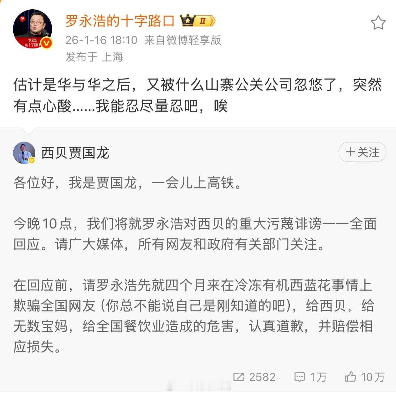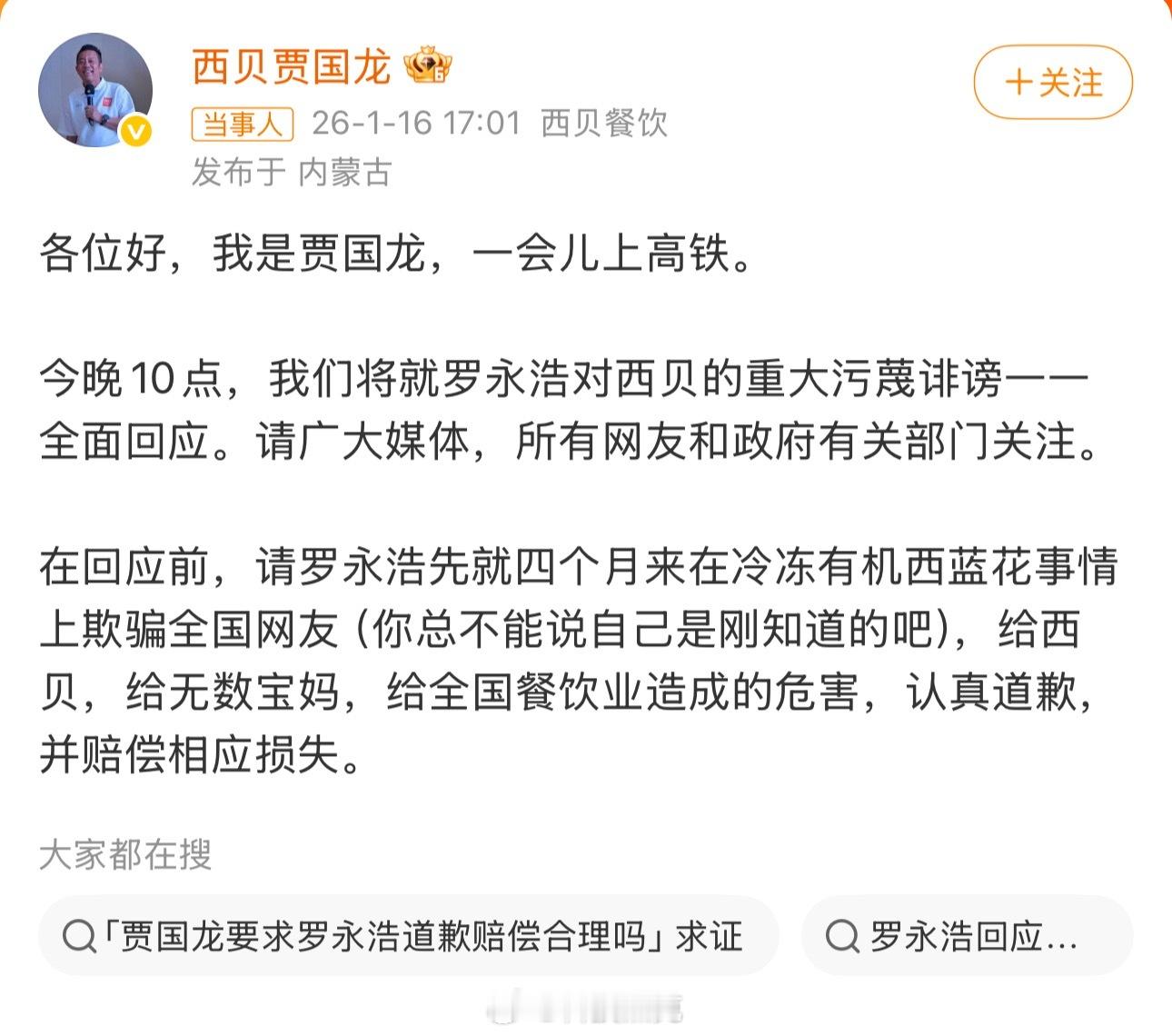 贾国龙今晚10点全面回应 【罗永浩回应贾国龙喊话】看得出来,很憋屈,倾诉欲很强。一个强硬久了的老板吃这么大瘪确实难以消化,发泄发泄也好