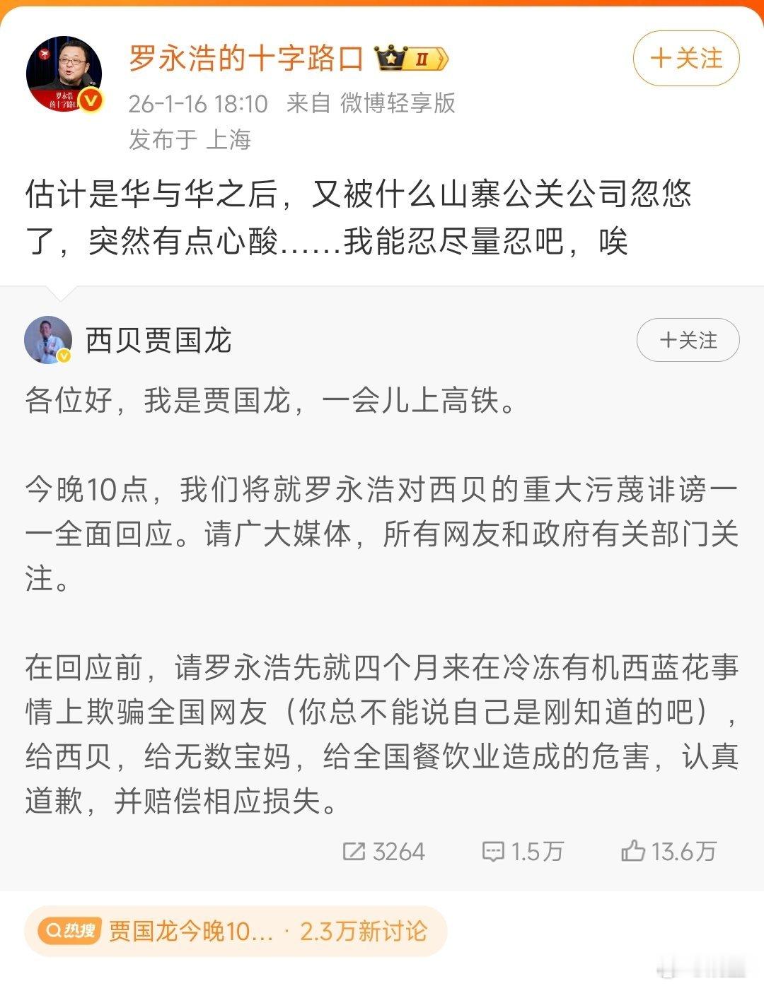 贾国龙今晚10点全面回应热搜爆了……贾国龙剑指罗永浩对西贝的重大污蔑诽谤罗永浩回应:又被什么山寨公关公司给忽悠了两边算是对上线了,这也是西贝公关的一部分?罗永浩回应贾国龙喊话