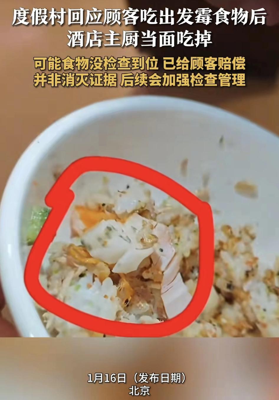 北京一度假区有游客反映在餐厅吃到发霉的食物,而主持师看到之后,一口就把食物吃掉了,顾客认为厨师并没有认真处理问题,而是在消灭证据。厨师长觉得自己并没有消灭证据,而是觉得食物并没有任何的问题。后续餐厅回应,他们通过多种方式与顾客沟通。已经把费用退还给顾客,后续会加强对食物的检查。