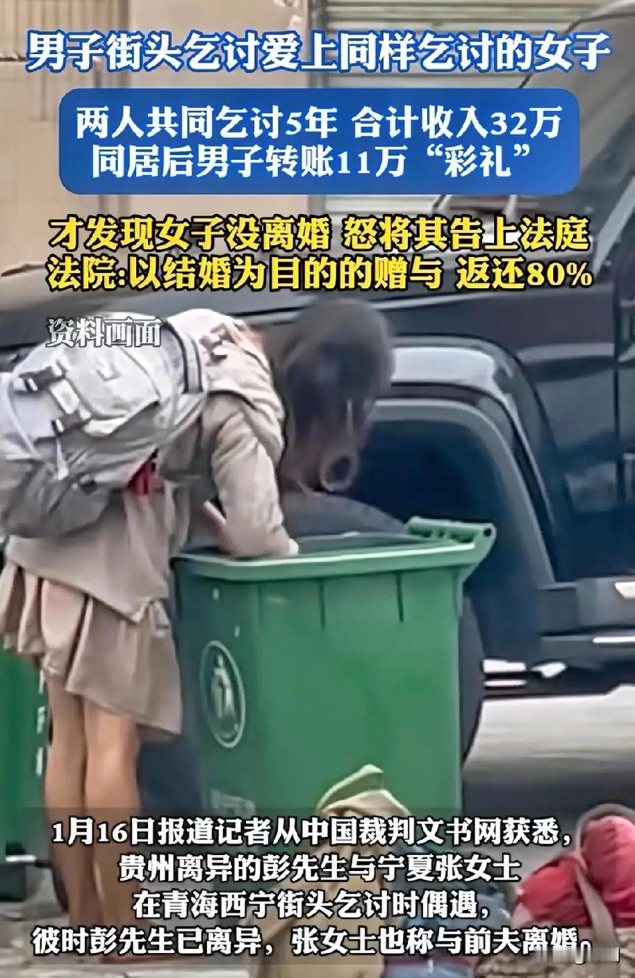 当乞讨的他遇见乞讨的她! 两人共同乞讨5年!合计收入32万! 同居后男子转账11万彩礼,才发现女子没离婚,又气又恼,要求退还“彩礼”将女子告上法庭! 1月16号记者报道,贵州离异的彭先生与宁夏的张女士在青海的街头乞讨时相遇,彭先生此时已离异单身,张女士称自己也是离异,两人迅速坠入爱河,共同开启了漫长的乞讨生活,5年间,乞讨收入共计32万元,张女士要求彩礼20万,彭先生向其转了11.19万元,结果发现张女士没离婚! 法院:判张女士返还80%(89536元),张女士不服上诉,二审维持原判! 话说回来,乞讨5年都有32万,上5年班绝对不可能有32万,原来乞讨那么挣钱,当牛马还要看人脸色,挣的钱还少,还要生闷气,面子算什么,扔下面子要票子!有没有搭子?我带上你,你带上碗,走起!冬天去三亚,夏天哈尔滨[呲牙]!红尘作伴从此活的潇潇洒洒……