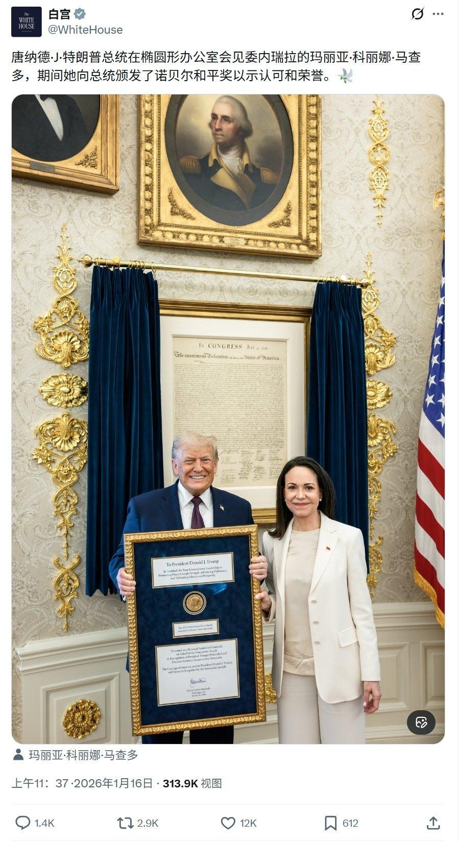 特朗普对和平奖的执念真是突破了想象! 2025年,马查多获得诺贝尔和平奖,而志在必得的特朗普落选成了他永远的遗憾,为此他碎碎念了不少次。 不过事情有转机,昨天,马查多把她的和平奖奖章,连带一封感谢信,装裱在一个相框里,献给了特朗普,而特朗普愉快地接受了,白宫官方账号也发了这条消息。 虽然挪威诺贝尔委员会早就说了和平奖不能私下转让和分享,但这并未能阻止马查多和特朗普之间的行为。 实在是想不通,特朗普这么高的位置,能在全世界呼风唤雨,为什么还对这么个小小的奖如此在意呢,甚至不惜接受别人转让。 说真的,经此一场闹剧,诺贝尔和平奖的节操碎了一地,严肃性和权威性荡然无存,以后还能维持得下去吗? 你知道世界有草台班子,但不会想到草台班子到如此程度,有时都不敢相信,这是一人一票选出来的美国总统!