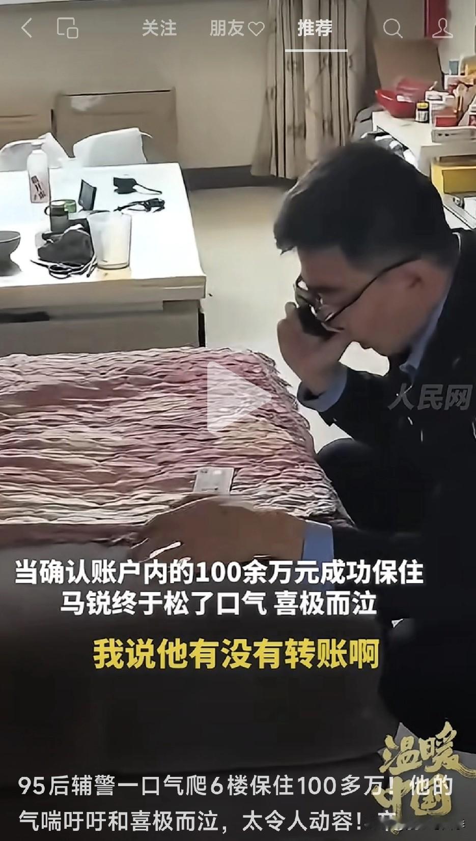 新疆乌鲁木齐95后辅警马锐飞奔上六楼,帮老人保住上100万资金后,坐在地上喜极而泣! 视频显示,老人的手机被骗子控制操作,这位帅气的警察气喘吁吁爬到六楼,告知说我是红庙子派出所的,你的手机是哪一个,有没有输入密码?老人说软件下载了,输入密码了,还没有确认! 赶紧拿过手机立刻关机取卡断网,然后又向银行打去电话确认,问这笔钱转账成功了没有,当对方说没有转账成功说,小民警哈哈笑了一声后有呜呜哭了起来,他是喜极而泣!在最后的关键时刻保住了老人的财产! 诈骗 图片来源于人民网