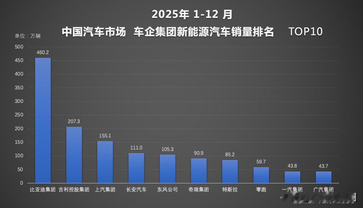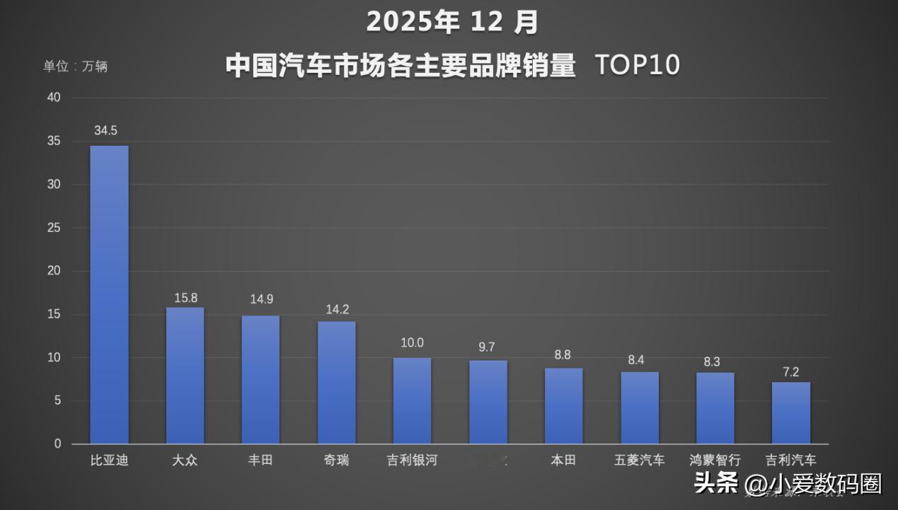 首先恭喜比亚迪全球四连冠,看看数字背后的意义这次真的不太一样了: 1、2025年中国品牌汽车销量榜单,第一名比亚迪销量是第二名大众的2倍还多,比亚迪是419.4万辆,大众186.6万辆,丰田156万辆,二三名加起来没有比亚迪多。 2、从整个新能源集团的维度来看,比亚迪集团2025年销量460万辆,同样比第二三名加起来还多。甚至达到二三四名加起来的总和。 3、高端的布局比亚迪同样给力,方程豹、腾势、仰望三品牌占比亚迪集团整体销量的比例,由2024年的4.5%,增长到2025年的8.7%,创历史新高。 4、2025年比亚迪乘用车及皮卡海外累计销售104.96万辆,同比增长145%,海外年销量首次突破百万。 向内练内功,高端车型销量翻倍,向外业务拓展,品牌影响力持续扩大。2025 年我国汽车产销双双突破 3400 万辆,连续多年稳居全球第一,2025年比亚迪全球四连冠,中国汽车品牌,从 “行业引领” 走向 “标准定义”,这就是这些数字背后的意义。