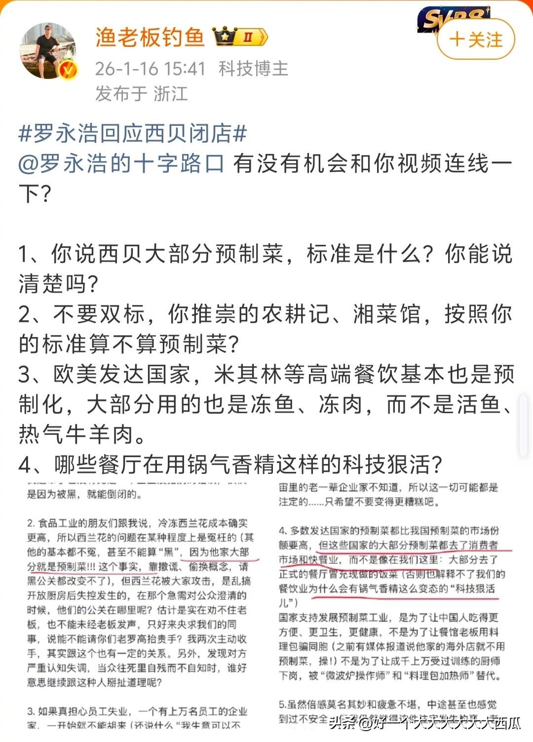 感觉罗永浩要是不能平稳的解决西贝这个事情, 可能后续真的要被爆, 其实建议罗永浩和这个质疑的大V博主连个线, 这个大V提出的预制菜标准、罗永浩推崇的几家餐馆是否预制菜、使用锅气香精的是哪些餐厅等等, 也是我们大众很想了解到的内容。