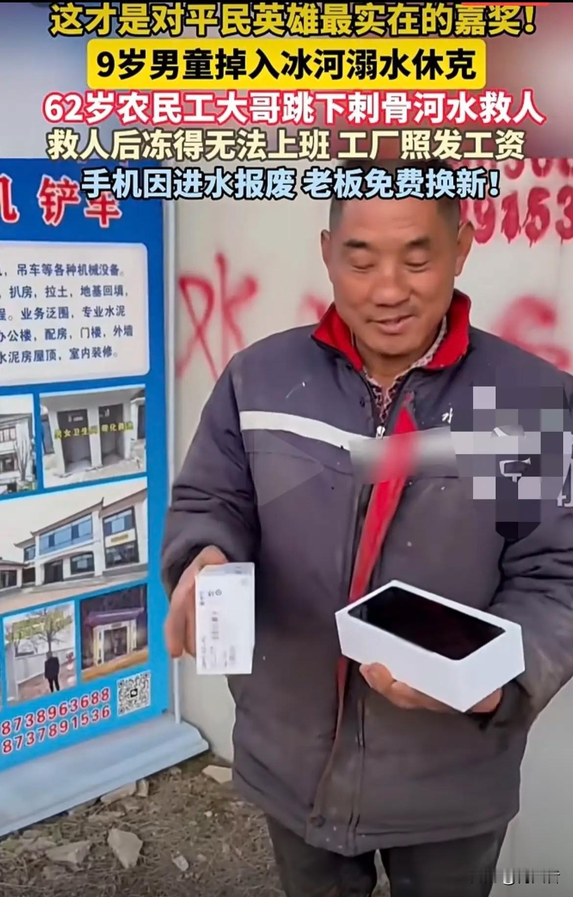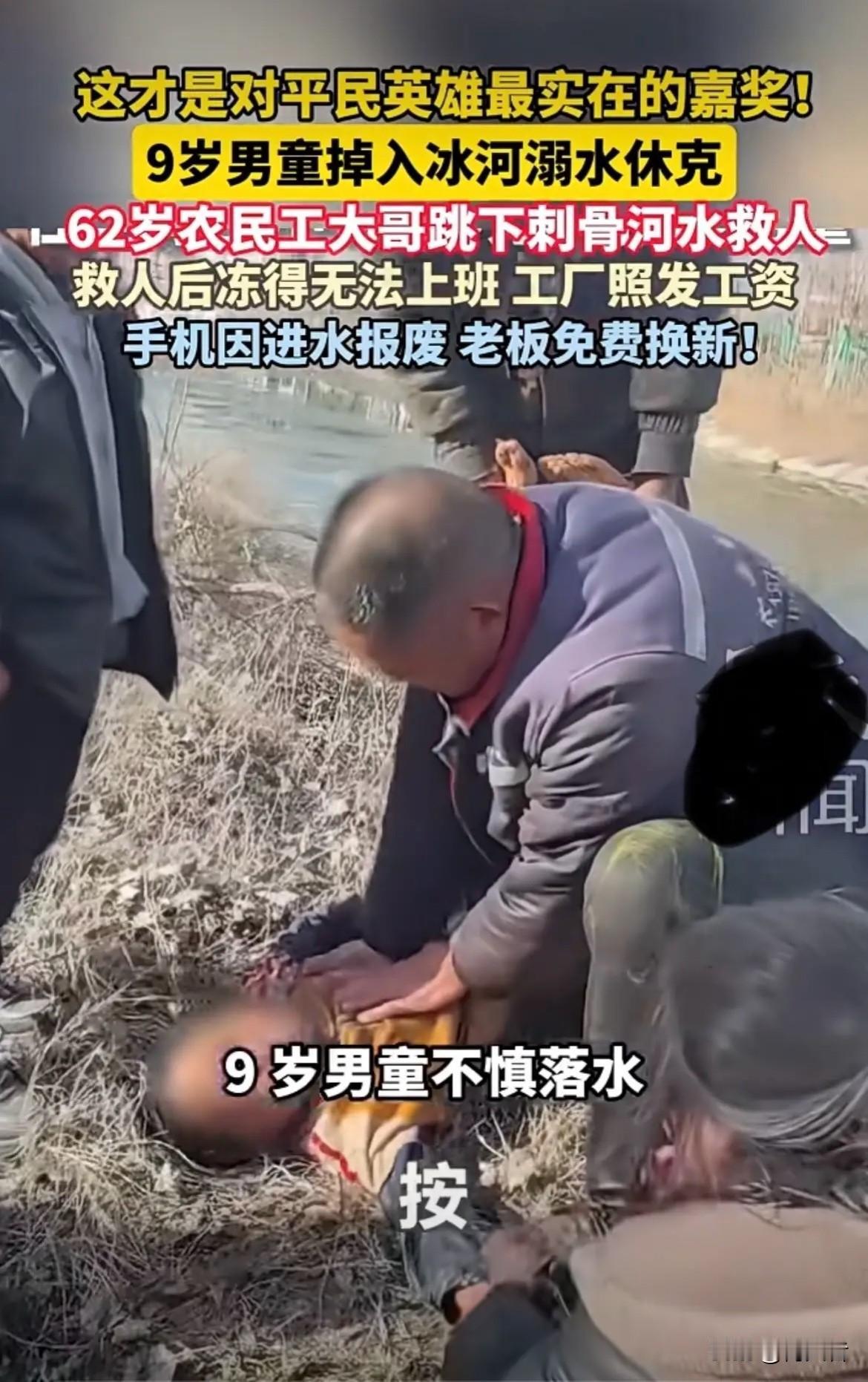 62岁农民工大哥简直太牛了!在看到男童掉进冰河溺水休克时,啥都没想就一头扎进那冷得像冰刀割肉的河水里。这要是换做普通人,估计腿都哆嗦得站不稳,可大哥就这么勇敢地冲上去了,这份勇气和善良,真不是一般人能有的,妥妥的平民英雄! 更让人感动的是大哥的工厂老板。大哥救完人后冻得没法上班,老板直接照发工资,手机报废了还免费换新。这老板太有人情味了,用最实在的方式嘉奖英雄,让大哥既暖心又安心。这就是好人有好报的真实写照。真心希望社会上能多些这样的正能量,让英雄们都能被温柔以待,别寒了他们的心!